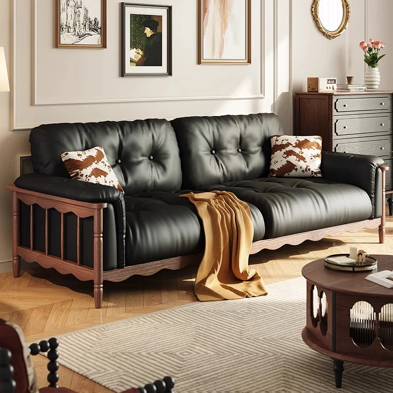 2025年新作!本革使用のヴィンテージ風ソファ - ブラック・クラウドデザイン、小型リビングに最適なオイルワックスレザーのフレンチレトロソファ。おしゃれで快適な空間を演出します!