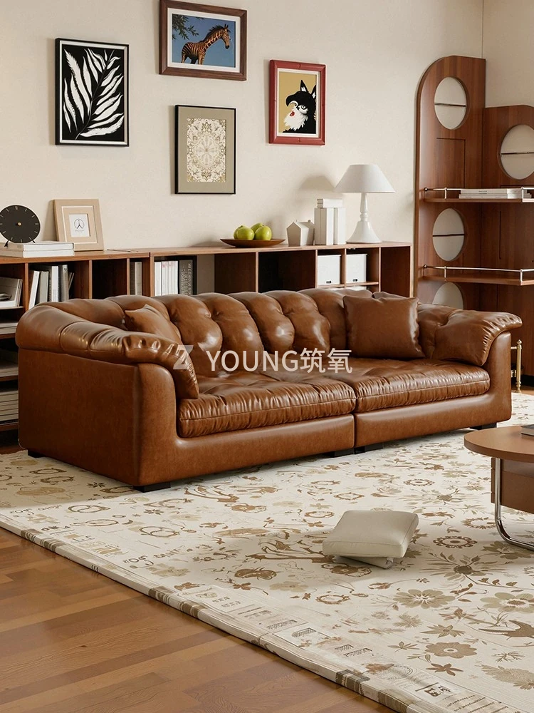 黒糖雲朵本革ソファ - 中古風のリビングにぴったりな黒色オイルワックス本革フレンチヴィンテージ直排ソファ!小型住宅にも最適!贅沢な質感と洗練されたデザインで、居心地の良い空間を演出します。