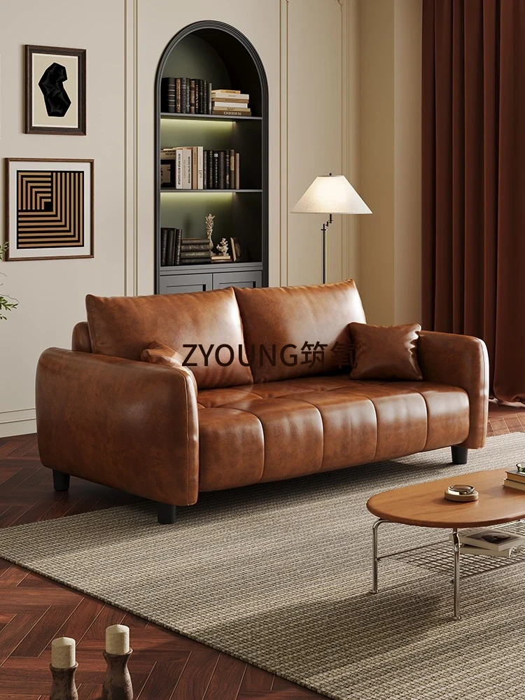 フランス風レトロオイルワックスレザーソファ - 小型リビングルームに最適なヴィンテージスタイルのブラウンストレートソファ。おしゃれで落ち着いた雰囲気を演出し、あなたのアパートを特別な空間に変えます!