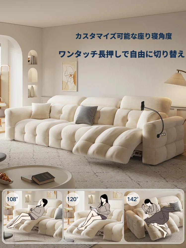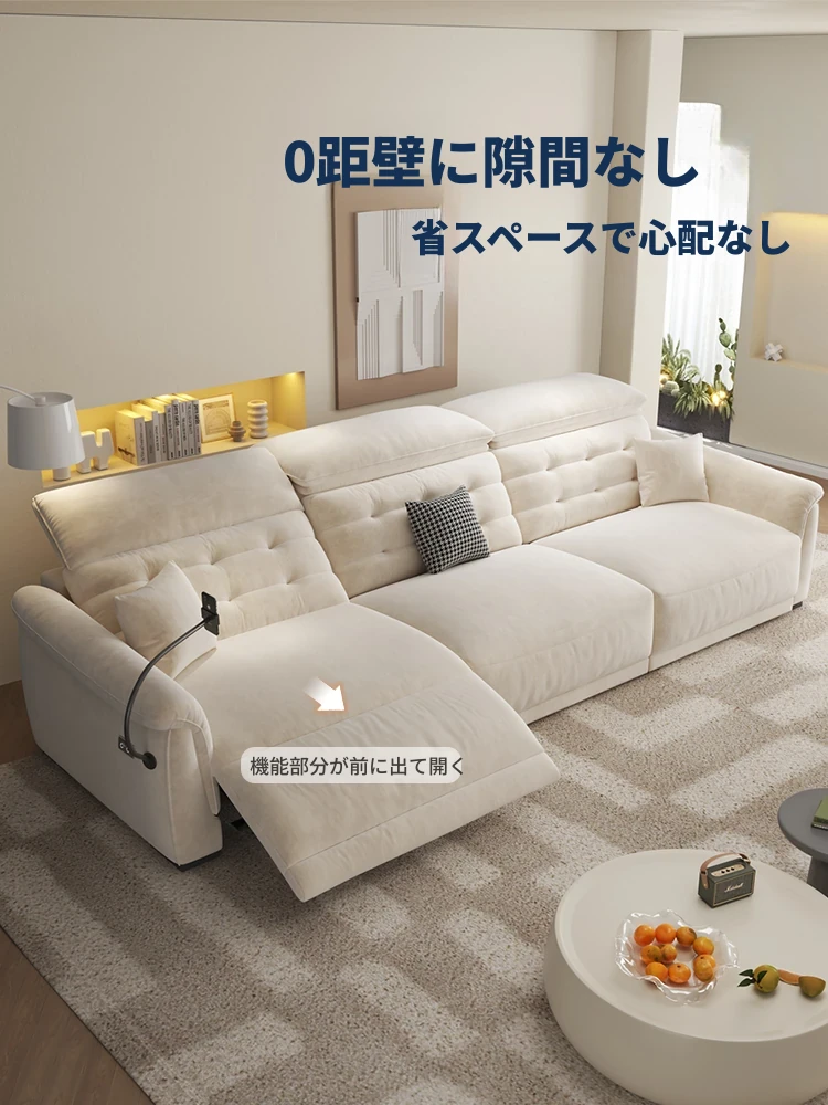 モダンでシンプルな宇宙電動機能リクライニングチェア!猫の爪も気にしない布張りの3人掛けソファ。小さな部屋にもぴったりなクリーム風デザインで、快適なリビング空間を実現します。