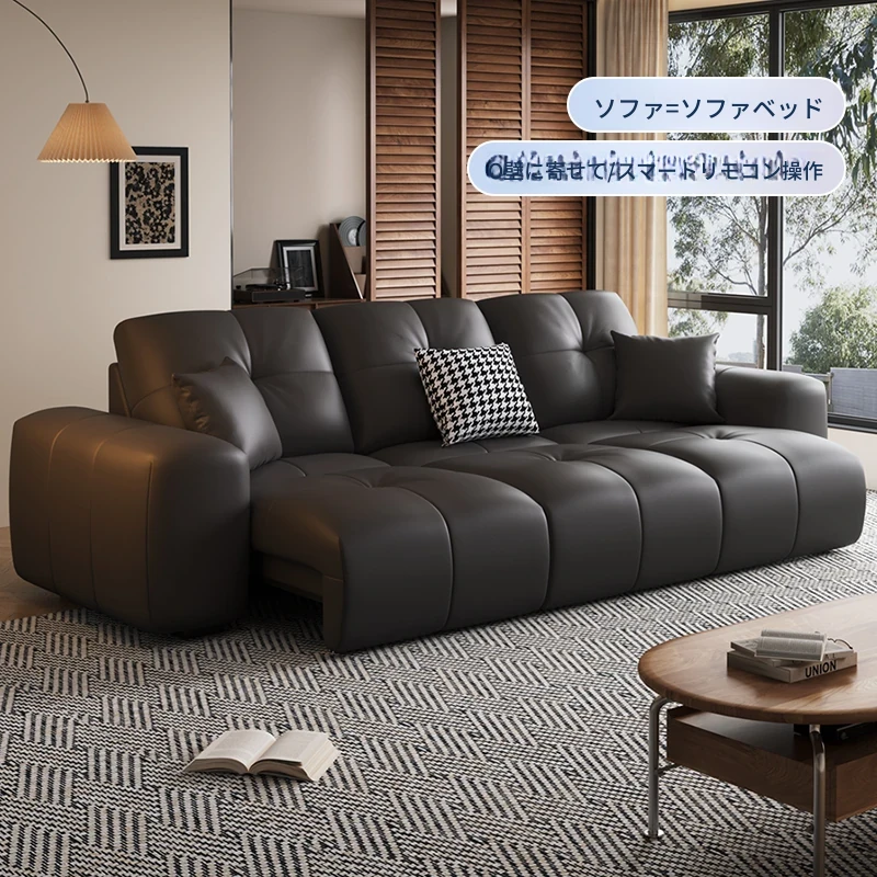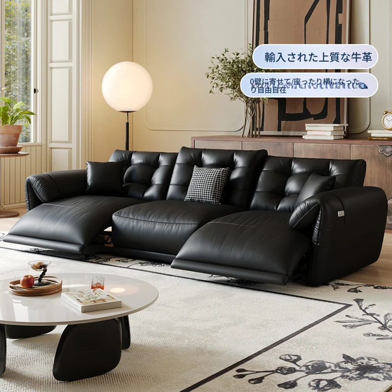 イタリアンミニマリスト本革ソファベッド - 電動リクライニング機能付き、リモコン操作で多機能!ブラックカラーのシンプルでモダンなデザイン、あなたのリビングにぴったりのスタイルを実現します。
