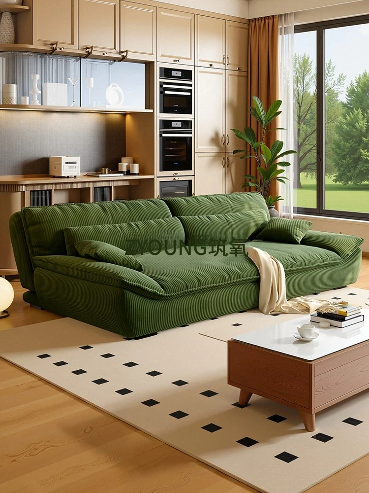 中古風のリビングルームにぴったり!デザイナーが手掛けた、ふわふわのコットンキャンディ雲のような直排シェニール素材のグリーンポフポフ布製ソファ。小型住宅でもおしゃれに使える、快適で癒しの空間を演出します!