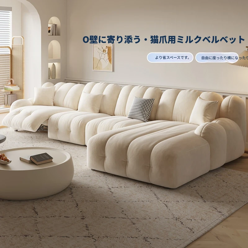 宇宙をテーマにした電動リクライニングソファ!モダンでシンプルなデザイン、猫の爪も気にしない高品質な生地使用。小さな部屋にもぴったりのクリームカラーで、居心地の良いリビングを演出します。