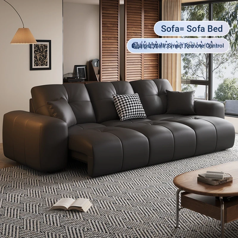 Italian Minimalist Genuine Leather Sofa Bed - Electric Multi-Functional Retractable Design with Remote Control - Black Modern Style for Your Living Room