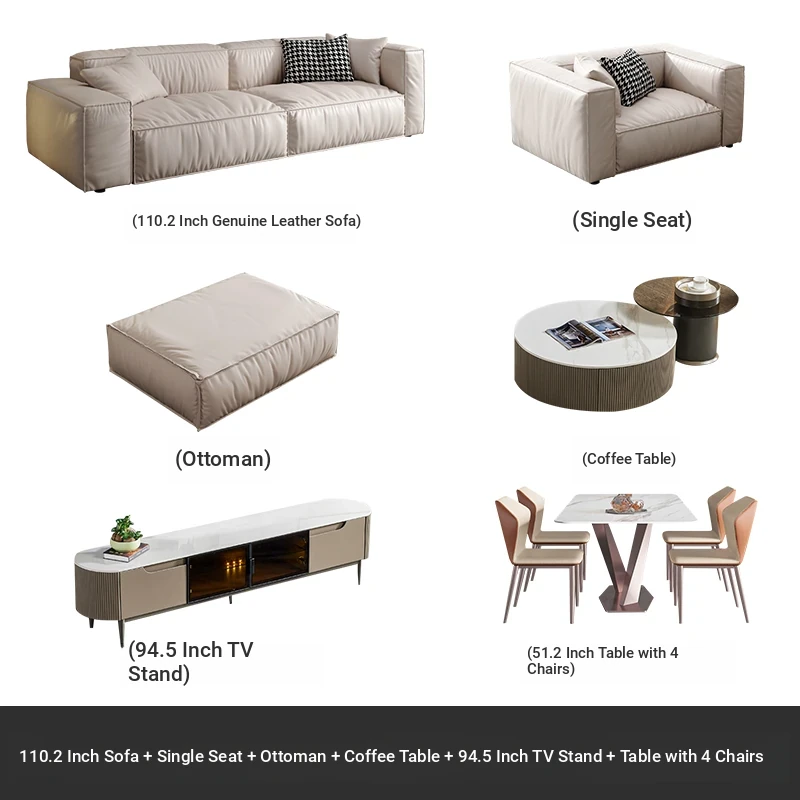 110.24 in sofa 4+1 + Step + tea table +78.74 in TV cabinet +1 table 4 chairs