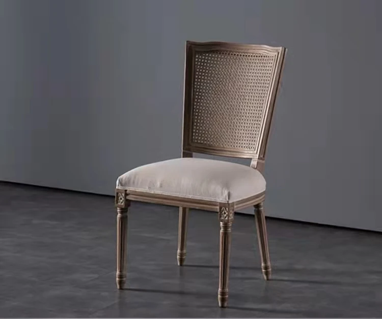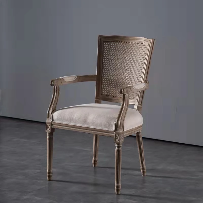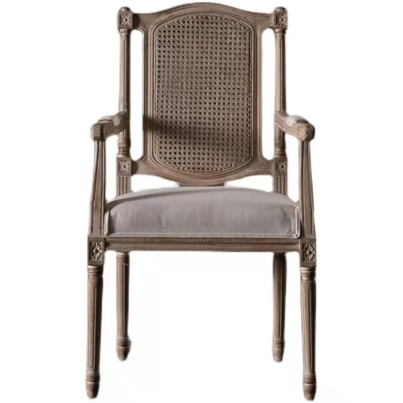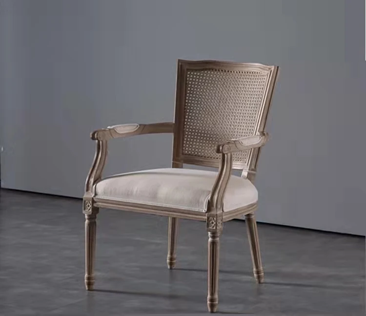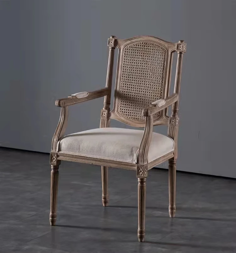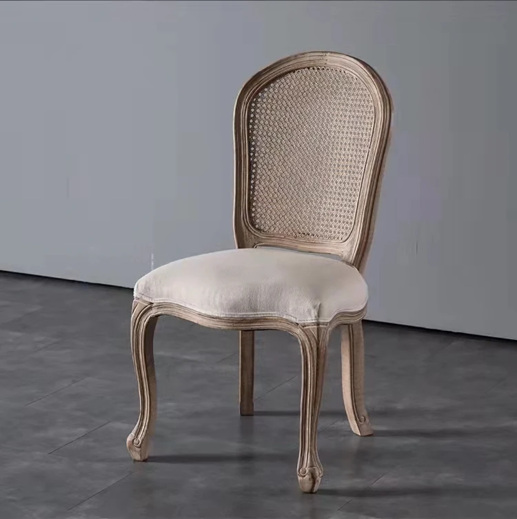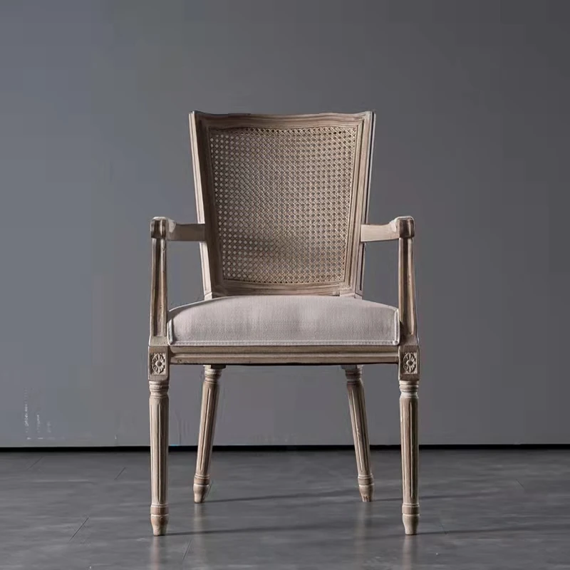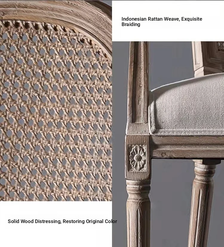 Vintage Rattan Dining Chair - Solid Wood French Style with Backrest, Perfect for Cafés, Bars, and Cozy BnBs - American Country Rustic Relaxation Armchair
