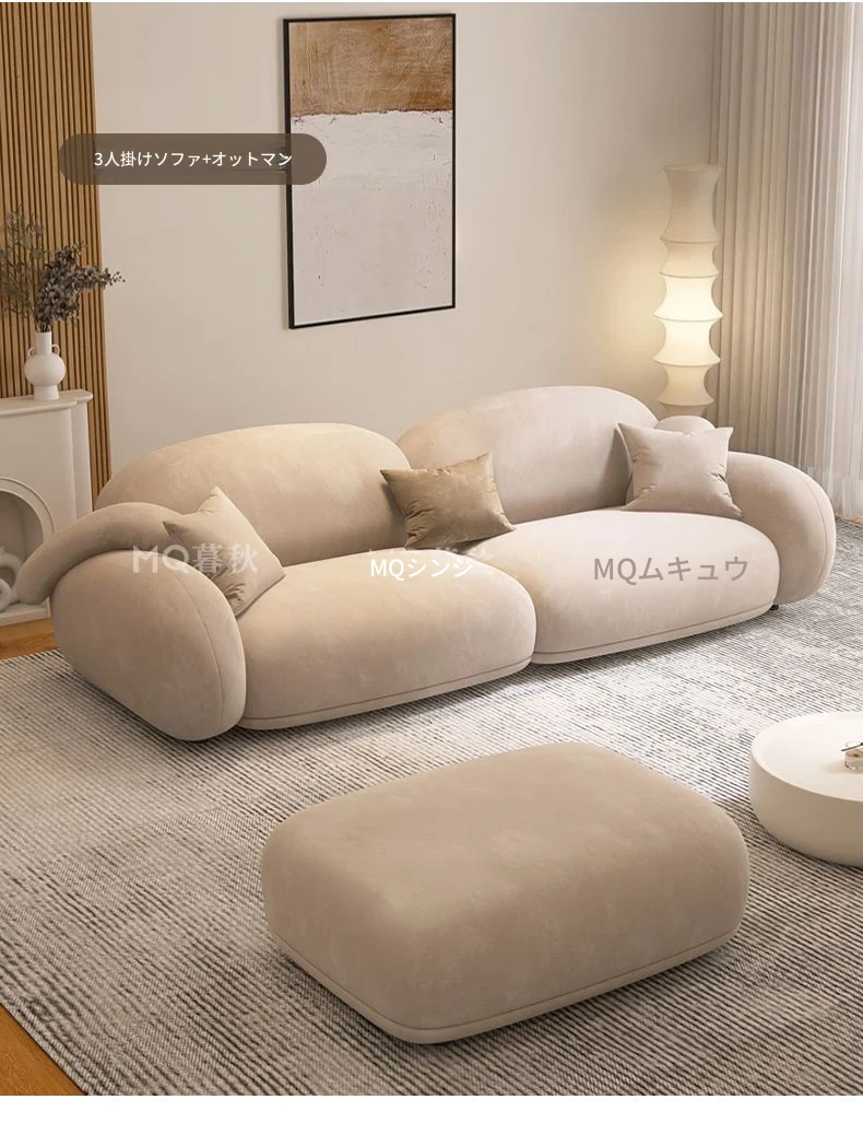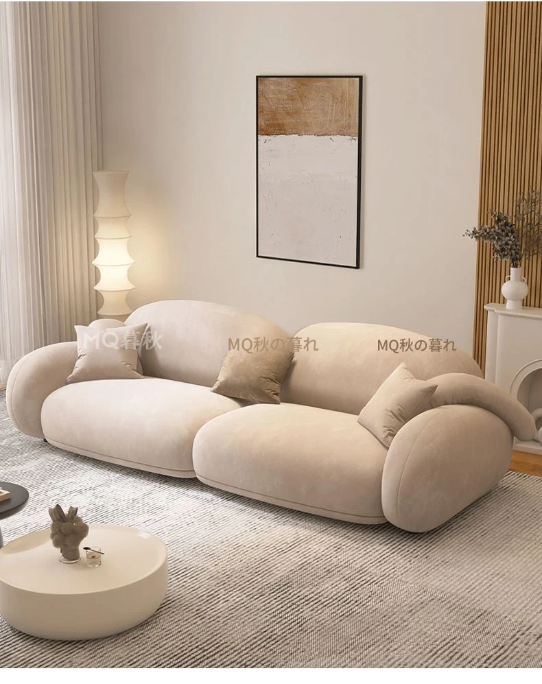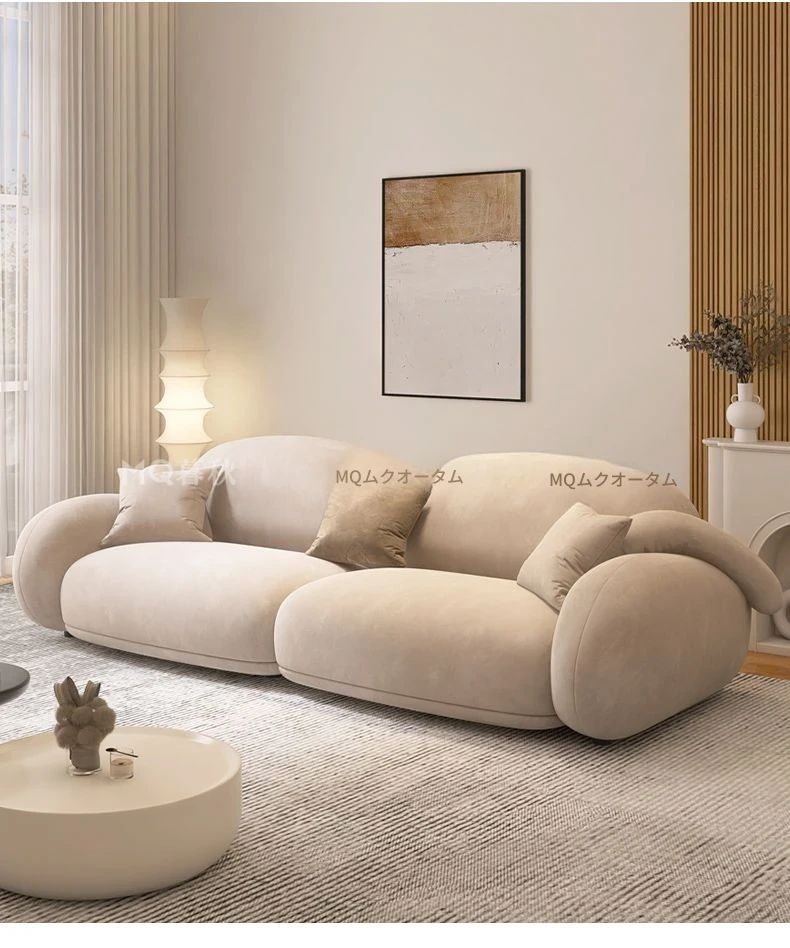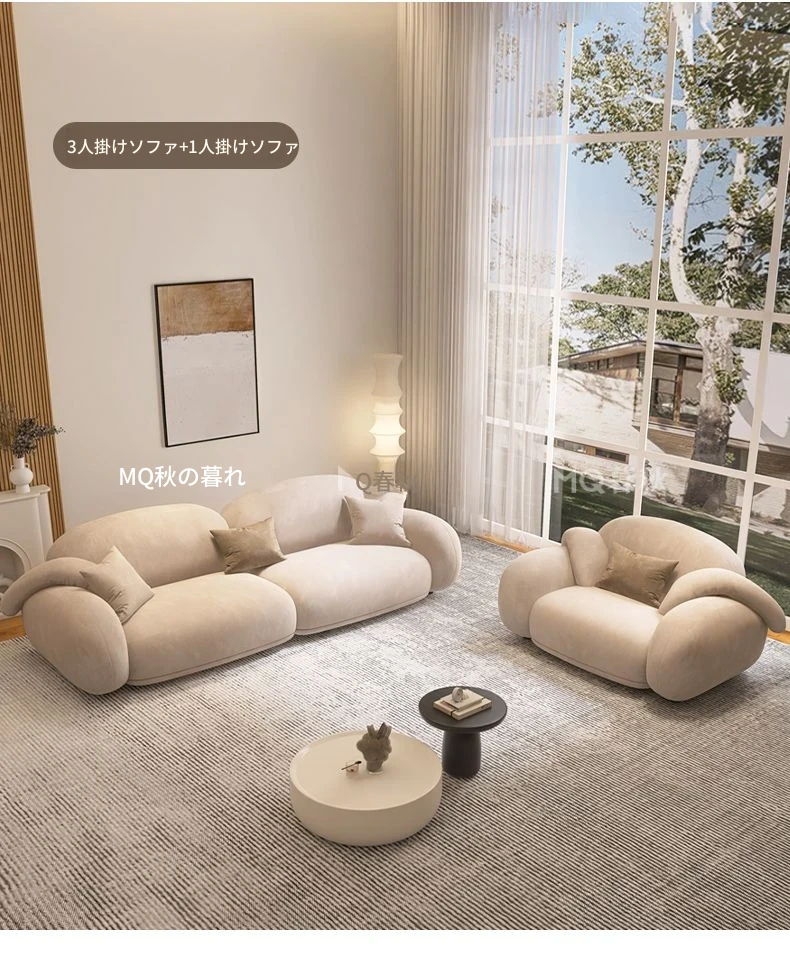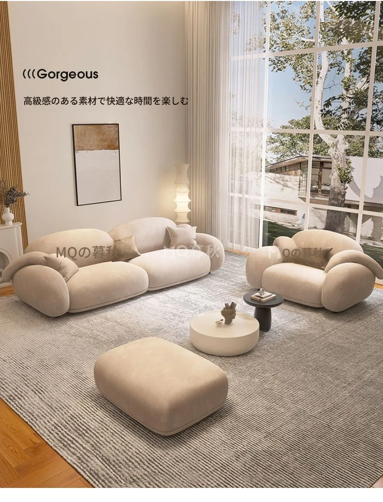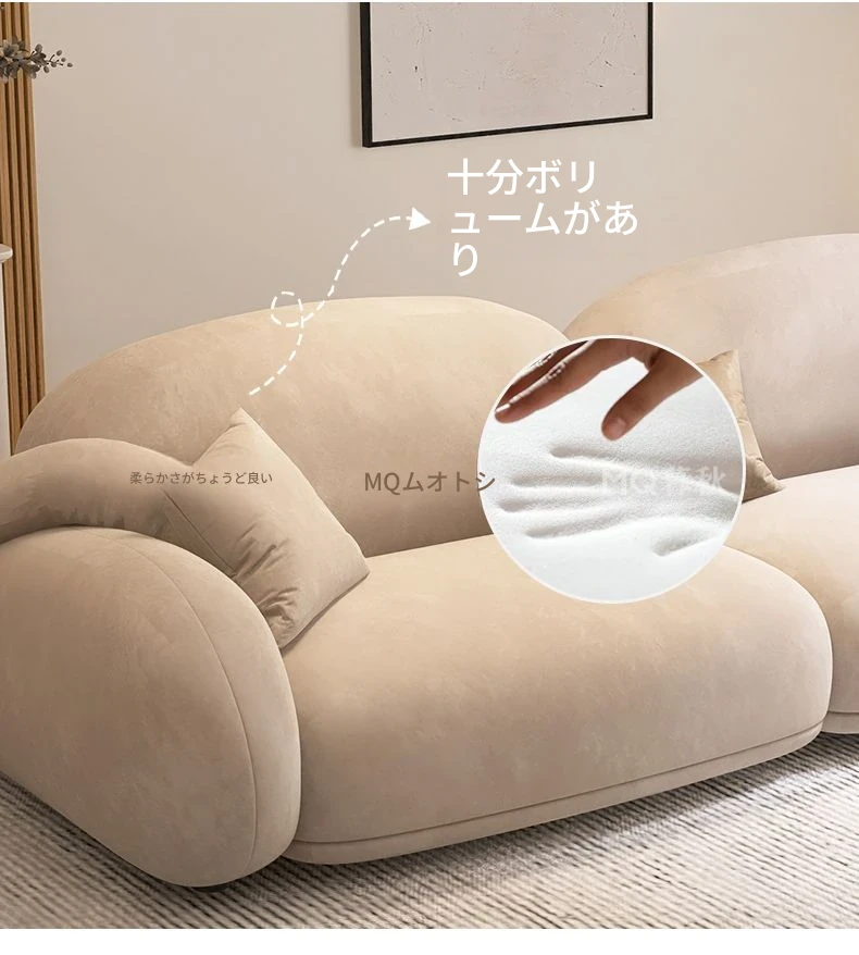 クリーミーな布製ソファー、猫の爪研ぎも安心!リビングにぴったりな柔らかな感触のフワフワ雲のようなデザイン。シンプルでありながら贅沢な二人掛けソファで、くつろぎの空間を演出します。