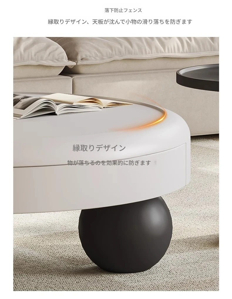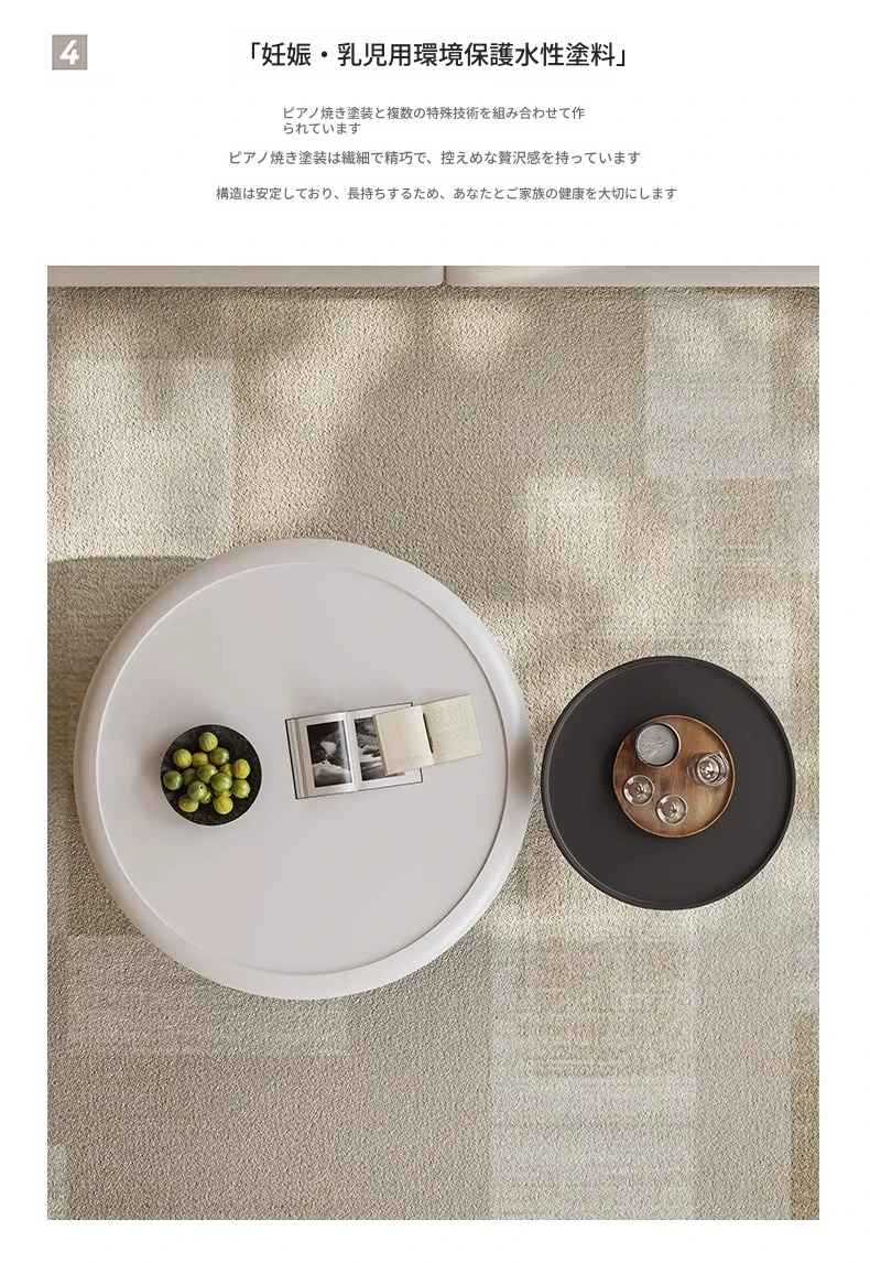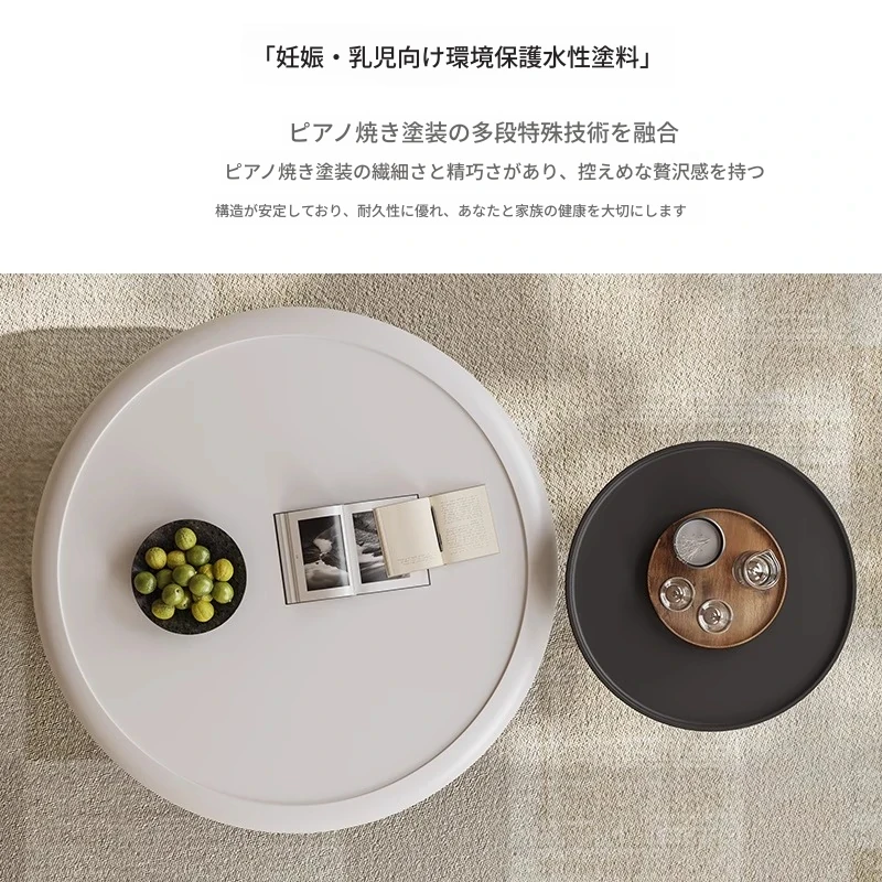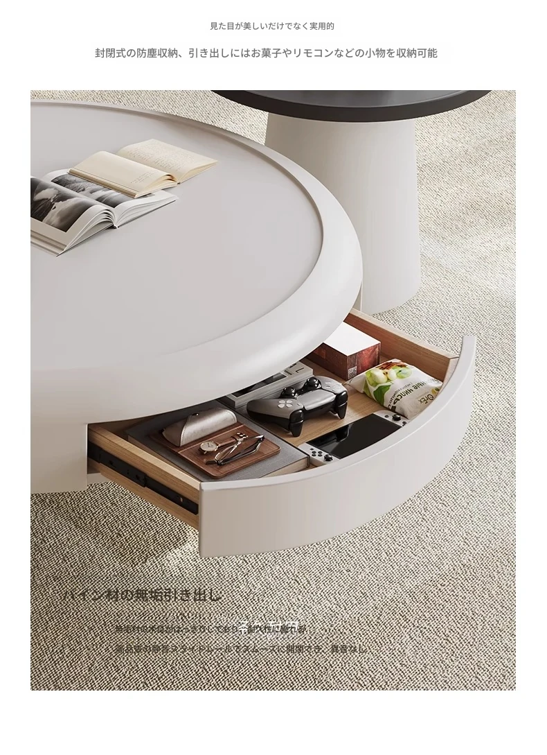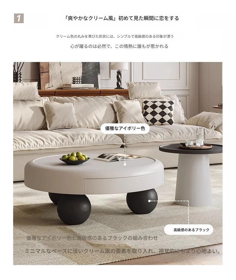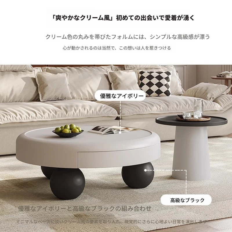 フレンチヴィンテージ風ラウンドコーヒーテーブル|高級感溢れるブラック&ホワイトの光沢仕上げ|収納引き出し付きで便利なサイドテーブル|スタイリッシュなリビングにぴったりなコンビネーション家具