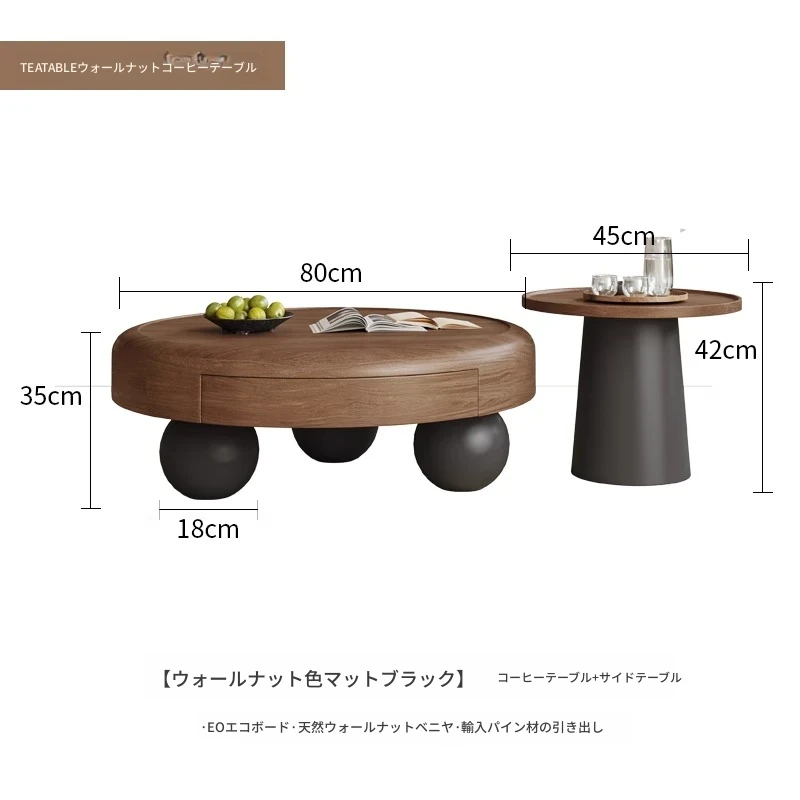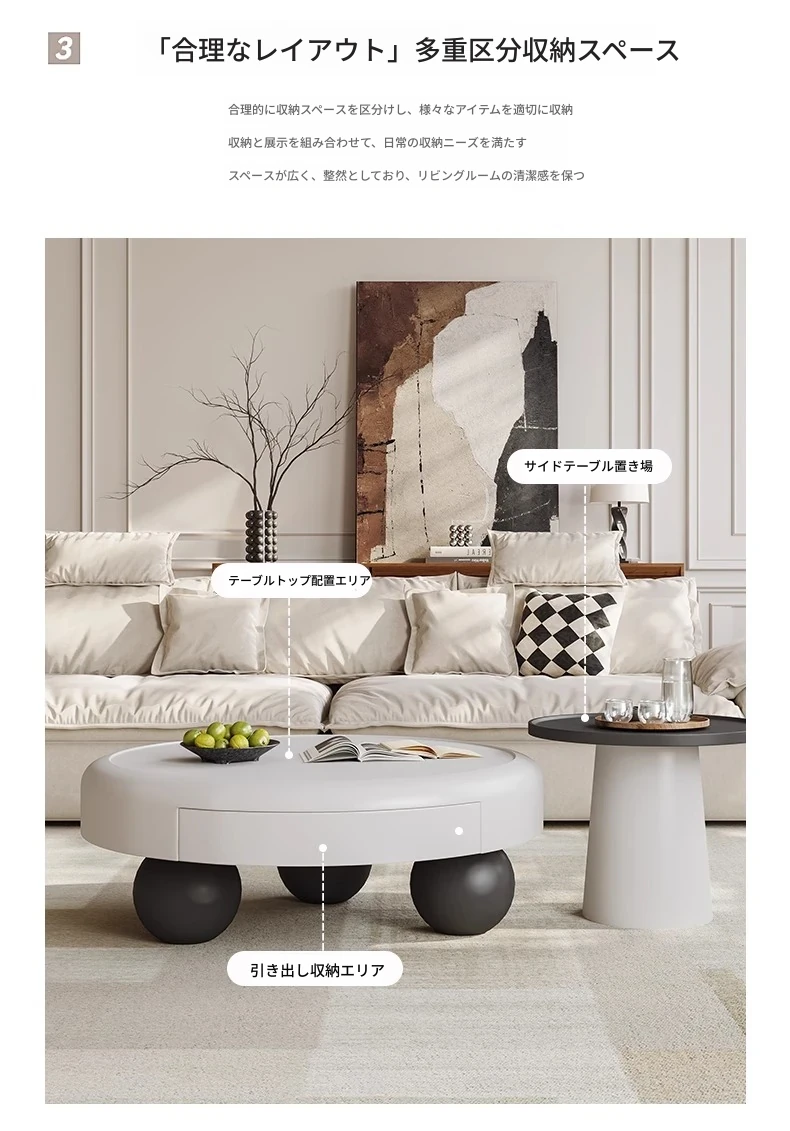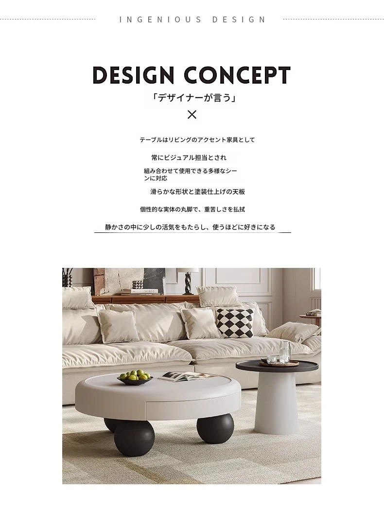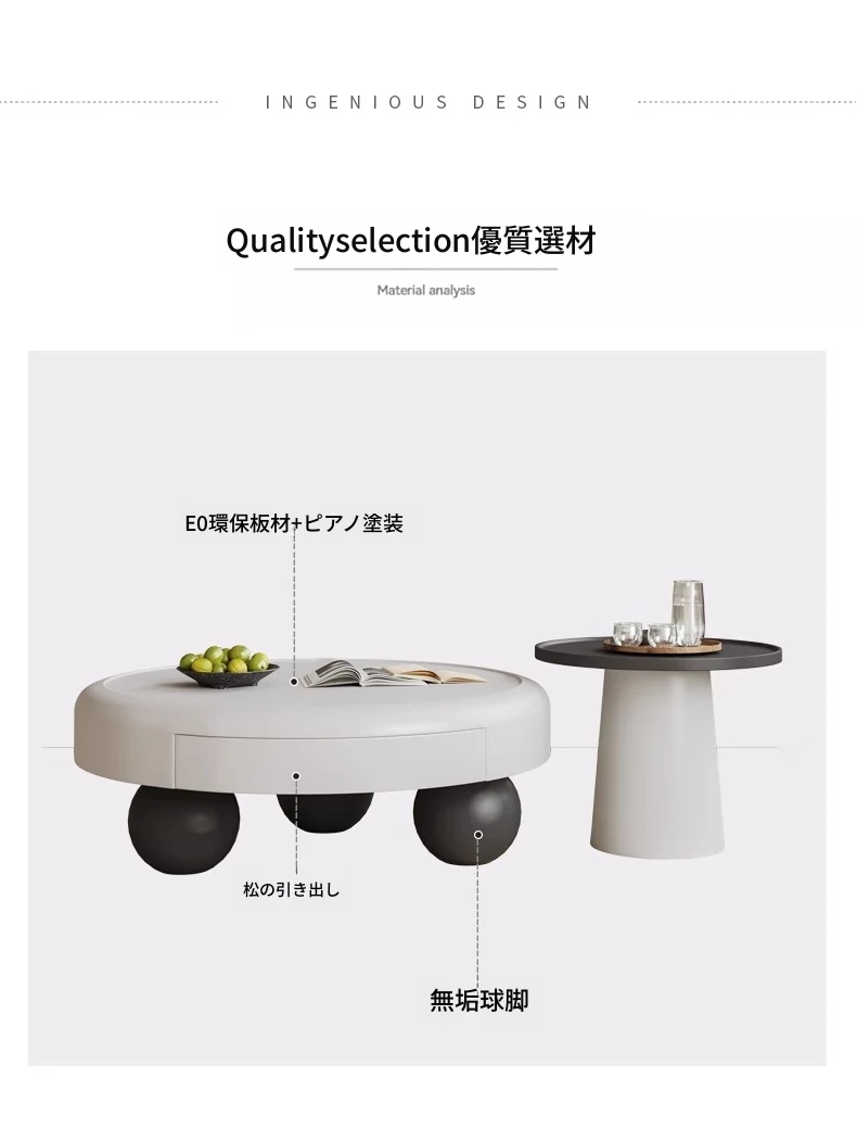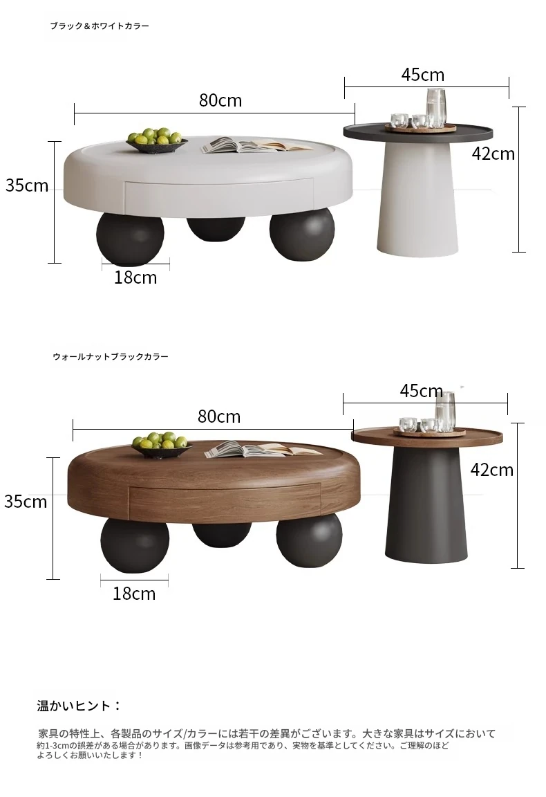 フレンチヴィンテージ風ラウンドコーヒーテーブル|高級感溢れるブラック&ホワイトの光沢仕上げ|収納引き出し付きで便利なサイドテーブル|スタイリッシュなリビングにぴったりなコンビネーション家具