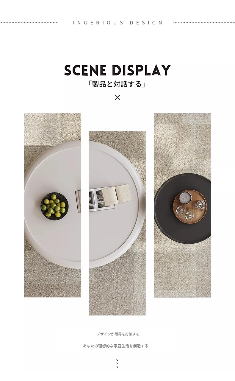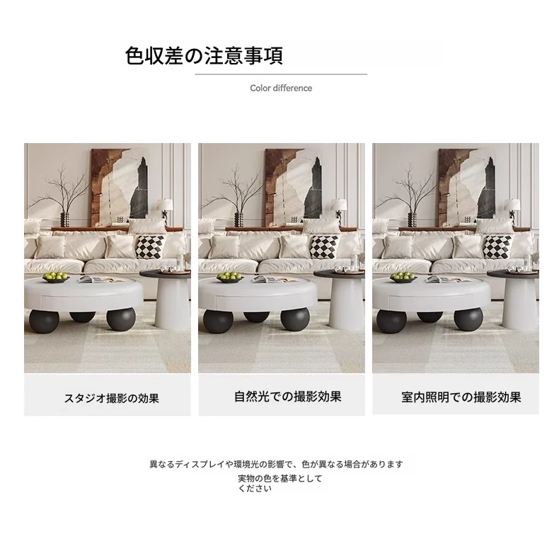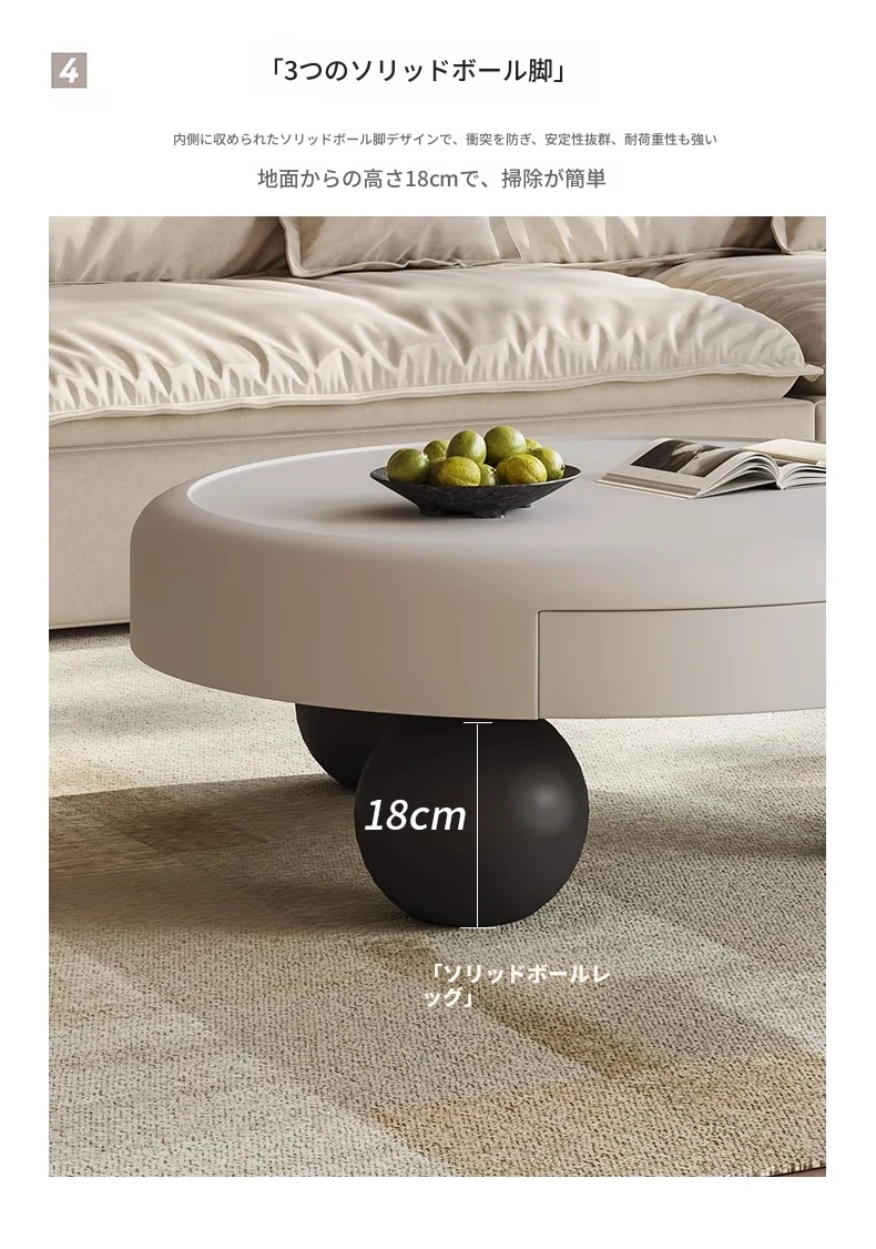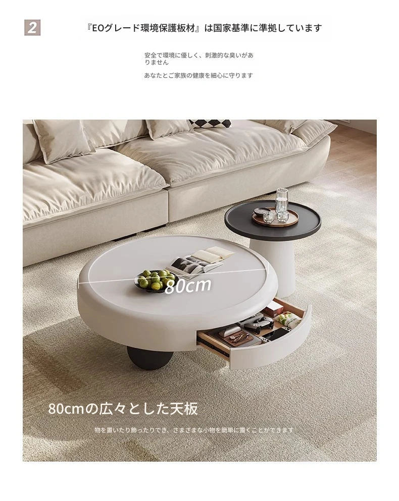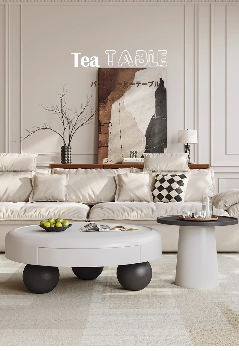 フレンチヴィンテージ風ラウンドコーヒーテーブル|高級感溢れるブラック&ホワイトの光沢仕上げ|収納引き出し付きで便利なサイドテーブル|スタイリッシュなリビングにぴったりなコンビネーション家具