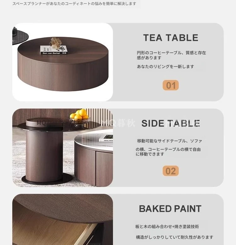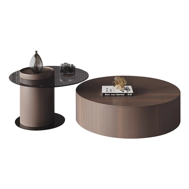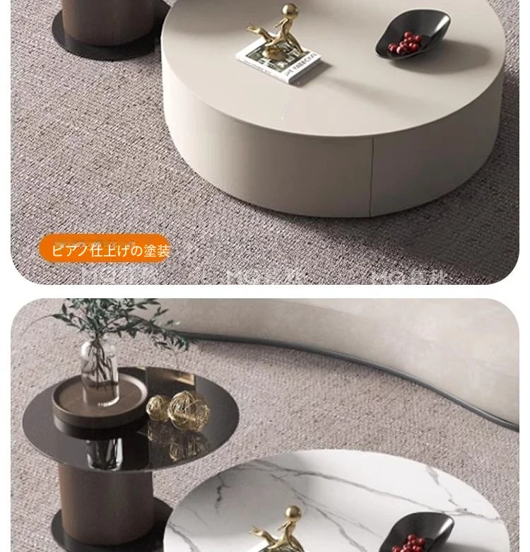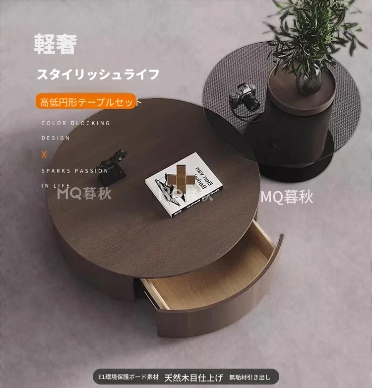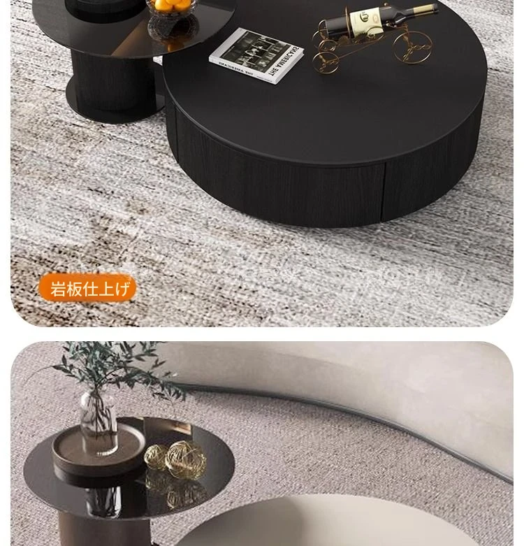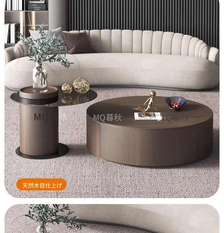 イタリアンスタイルのラウンドウッドコーヒーテーブルセット - 小さなリビングにぴったりのシンプルでモダンな軽奢デザイン、トレンドの岩板使用でおしゃれな空間を演出!