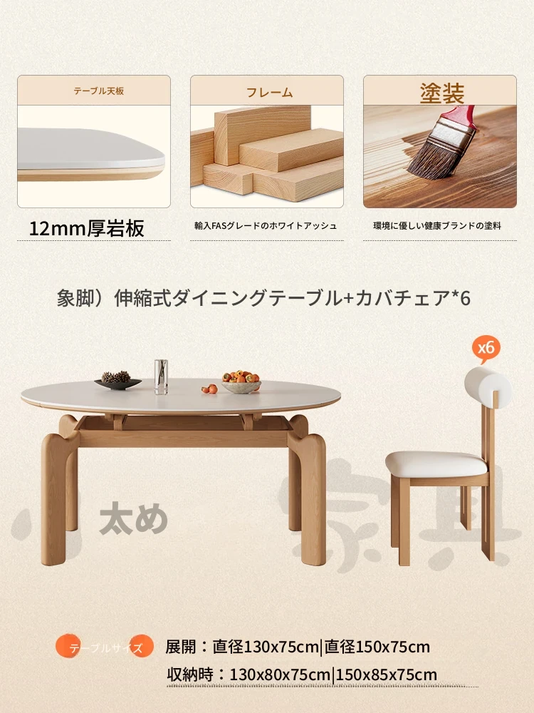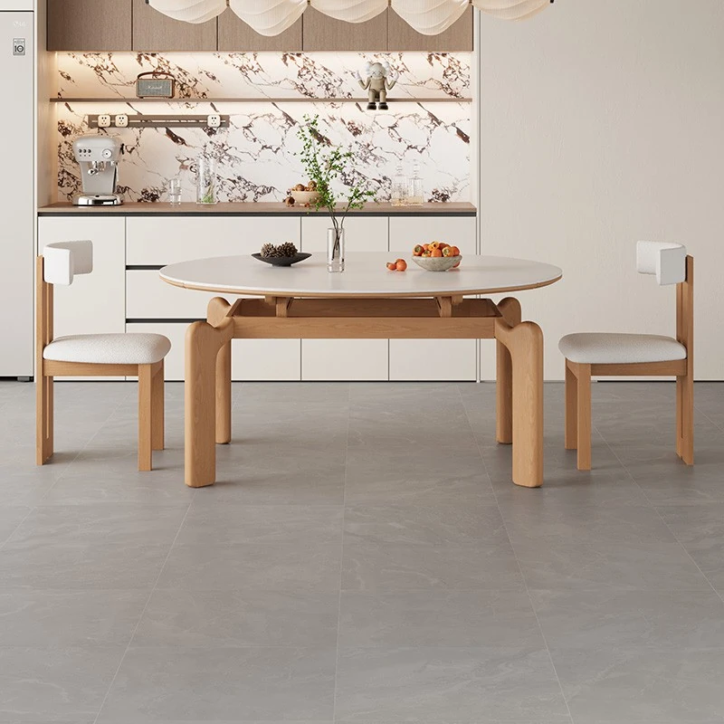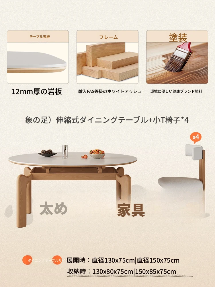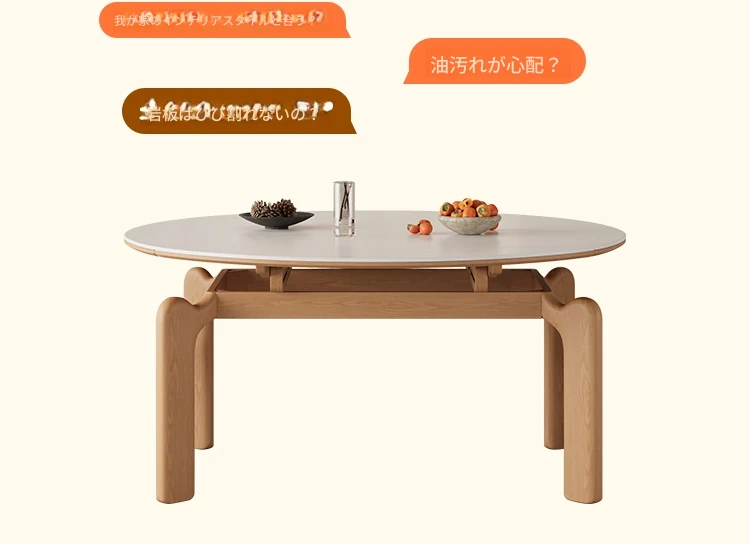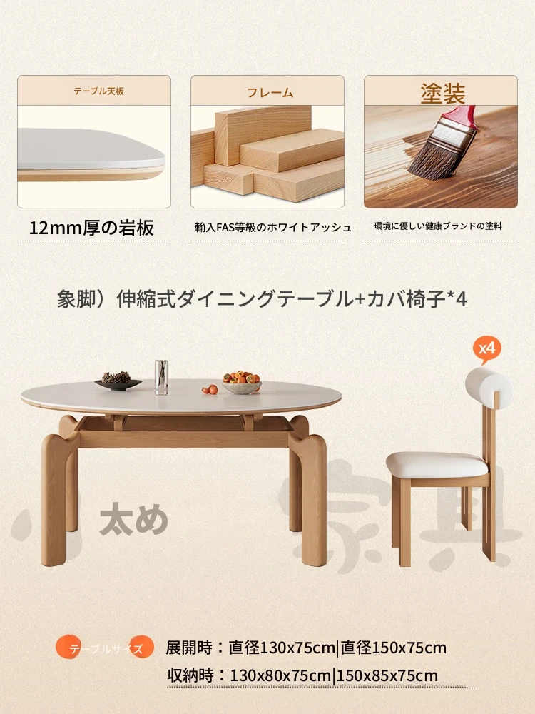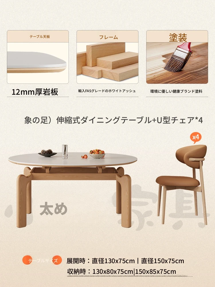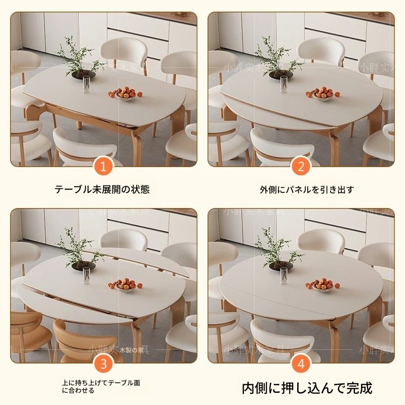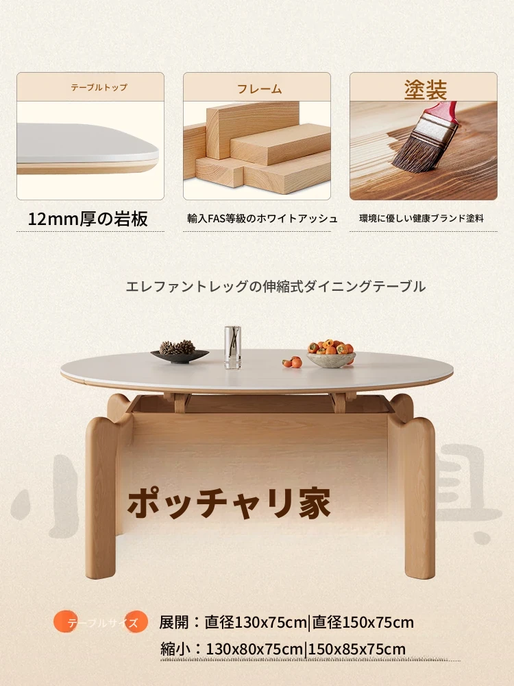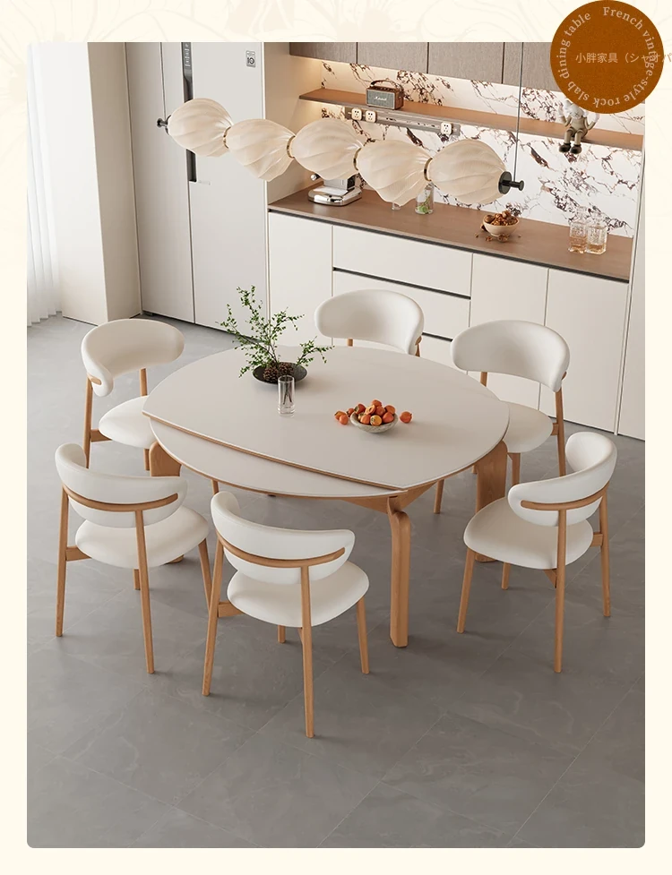 フランス風ナチュラルウッドクリーム仕上げの伸縮式ラウンドダイニングテーブル - 小型住宅に最適!四角と丸の両方に対応可能な折りたたみ式、家族や友人との食事にぴったりです。