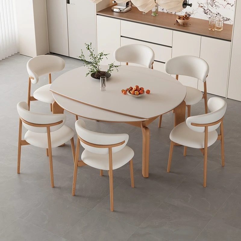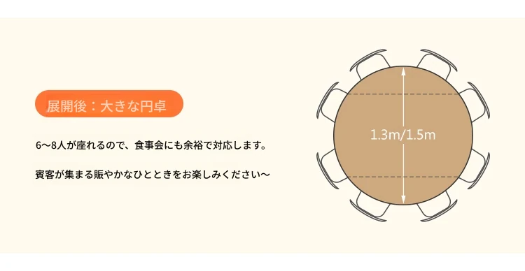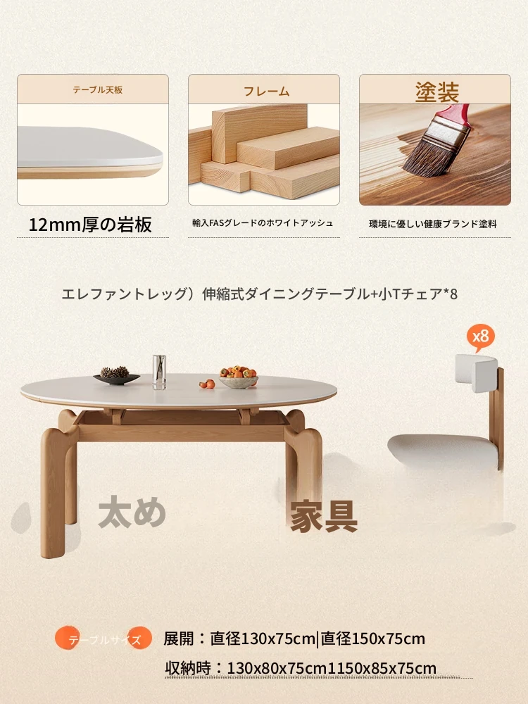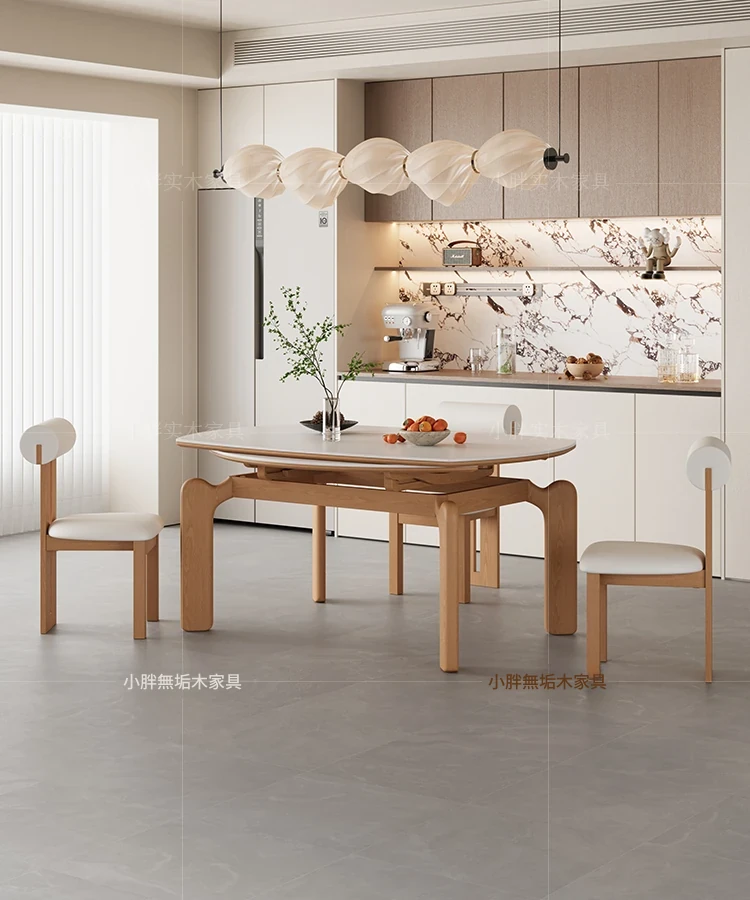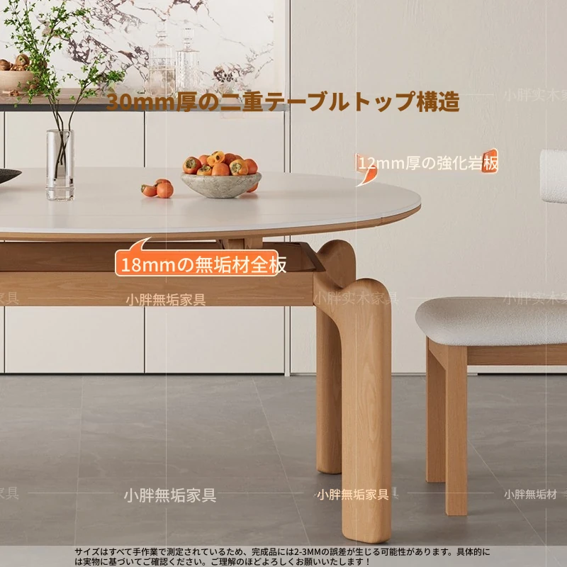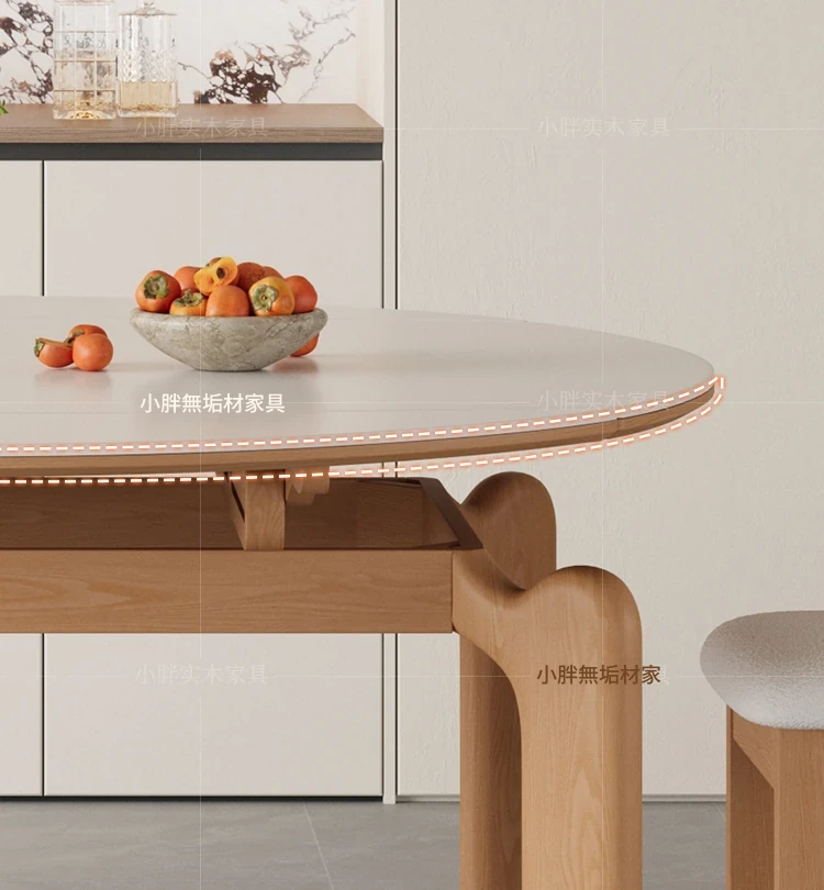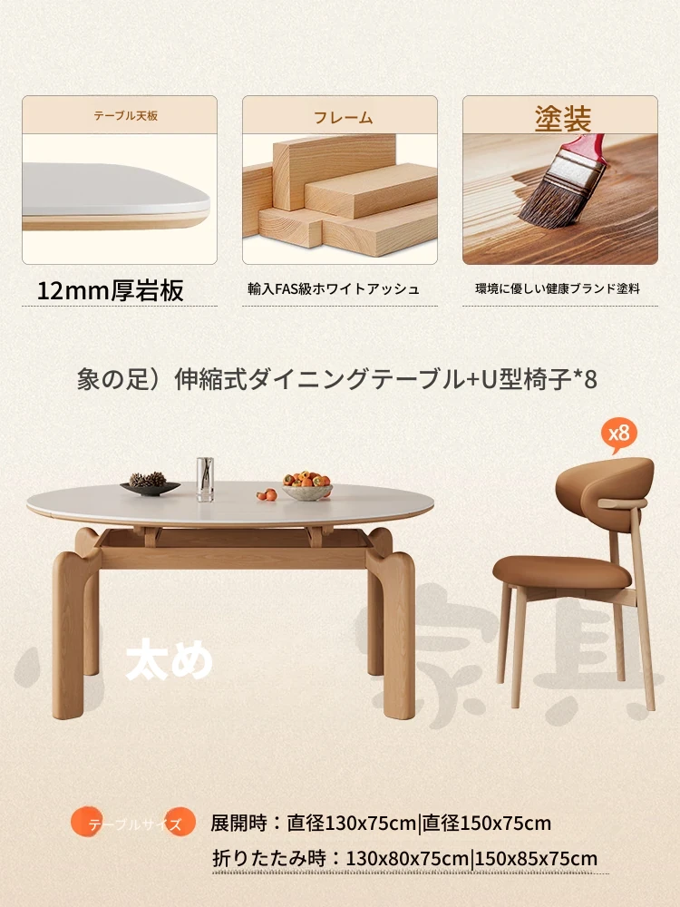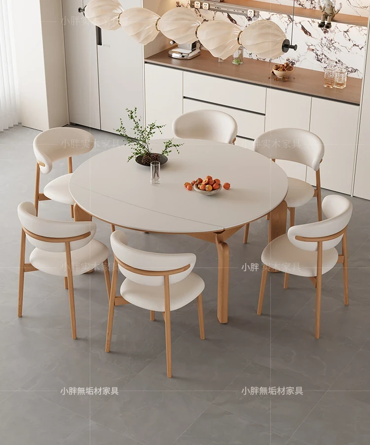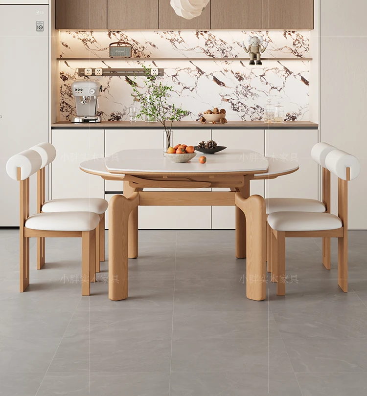 フランス風ナチュラルウッドクリーム仕上げの伸縮式ラウンドダイニングテーブル - 小型住宅に最適!四角と丸の両方に対応可能な折りたたみ式、家族や友人との食事にぴったりです。