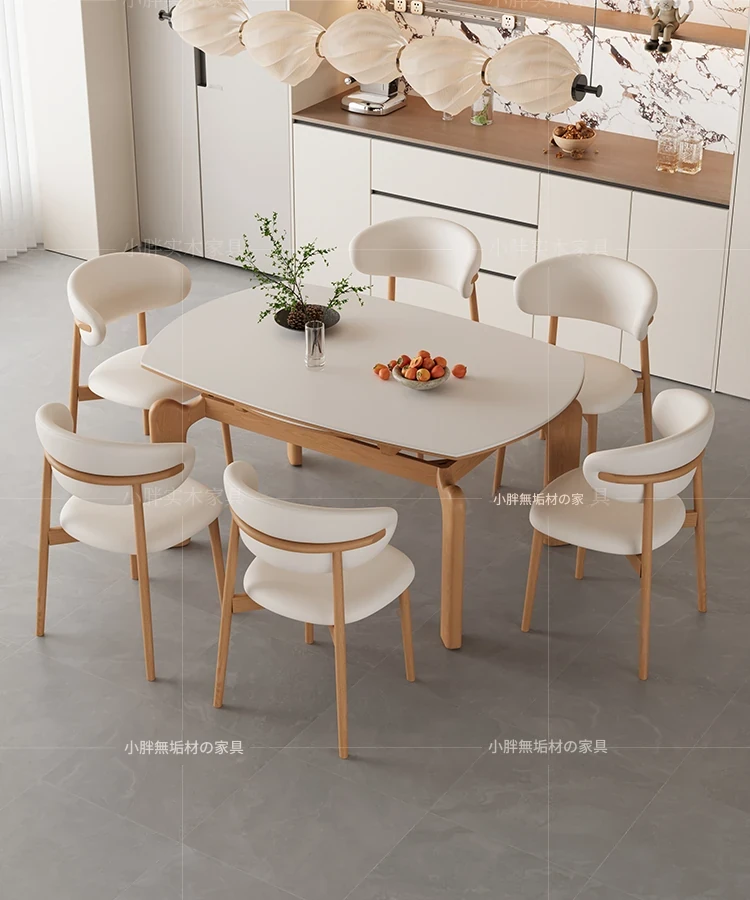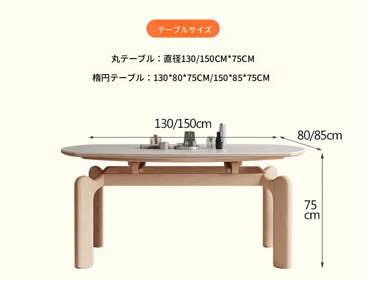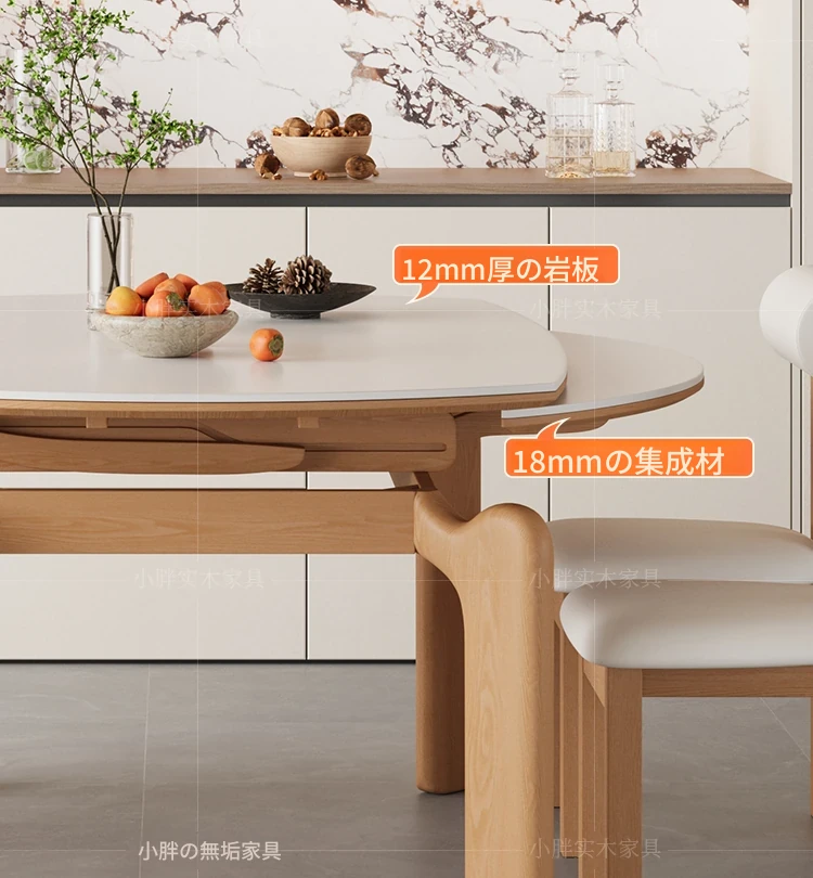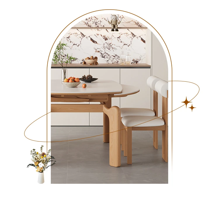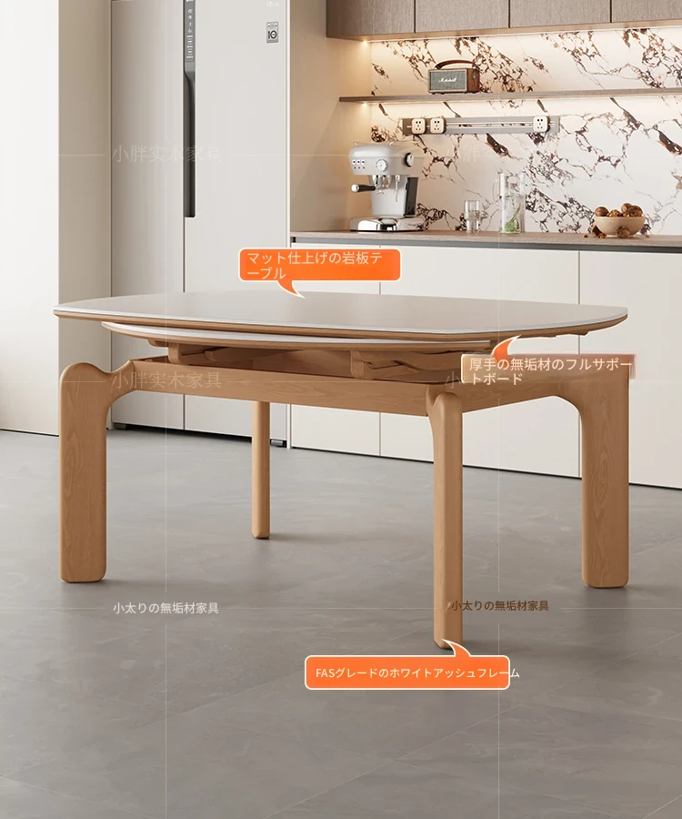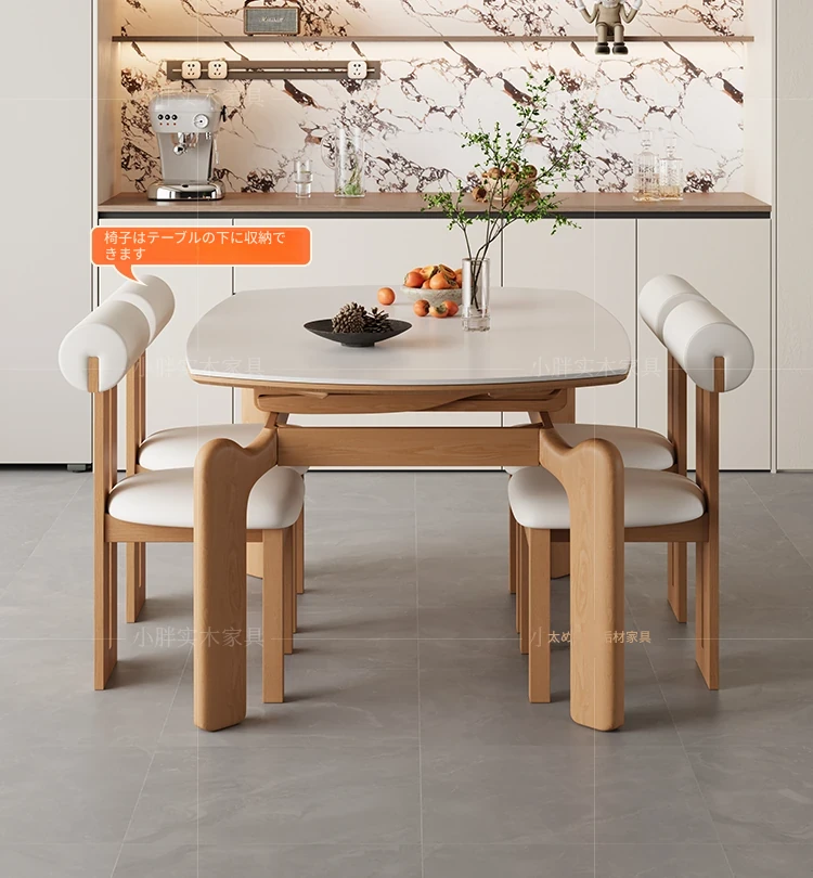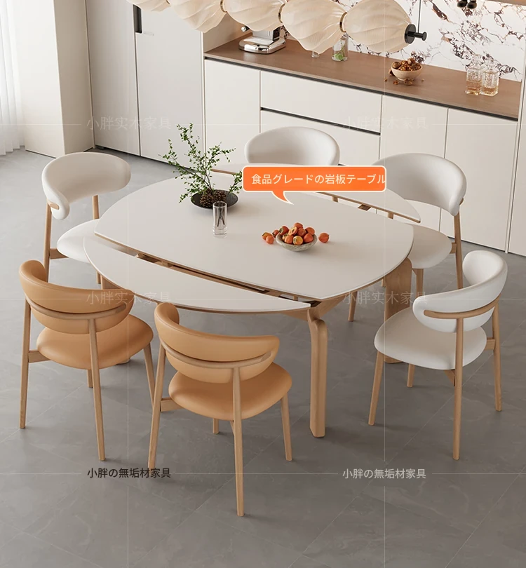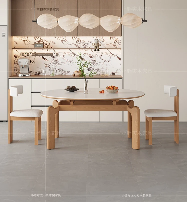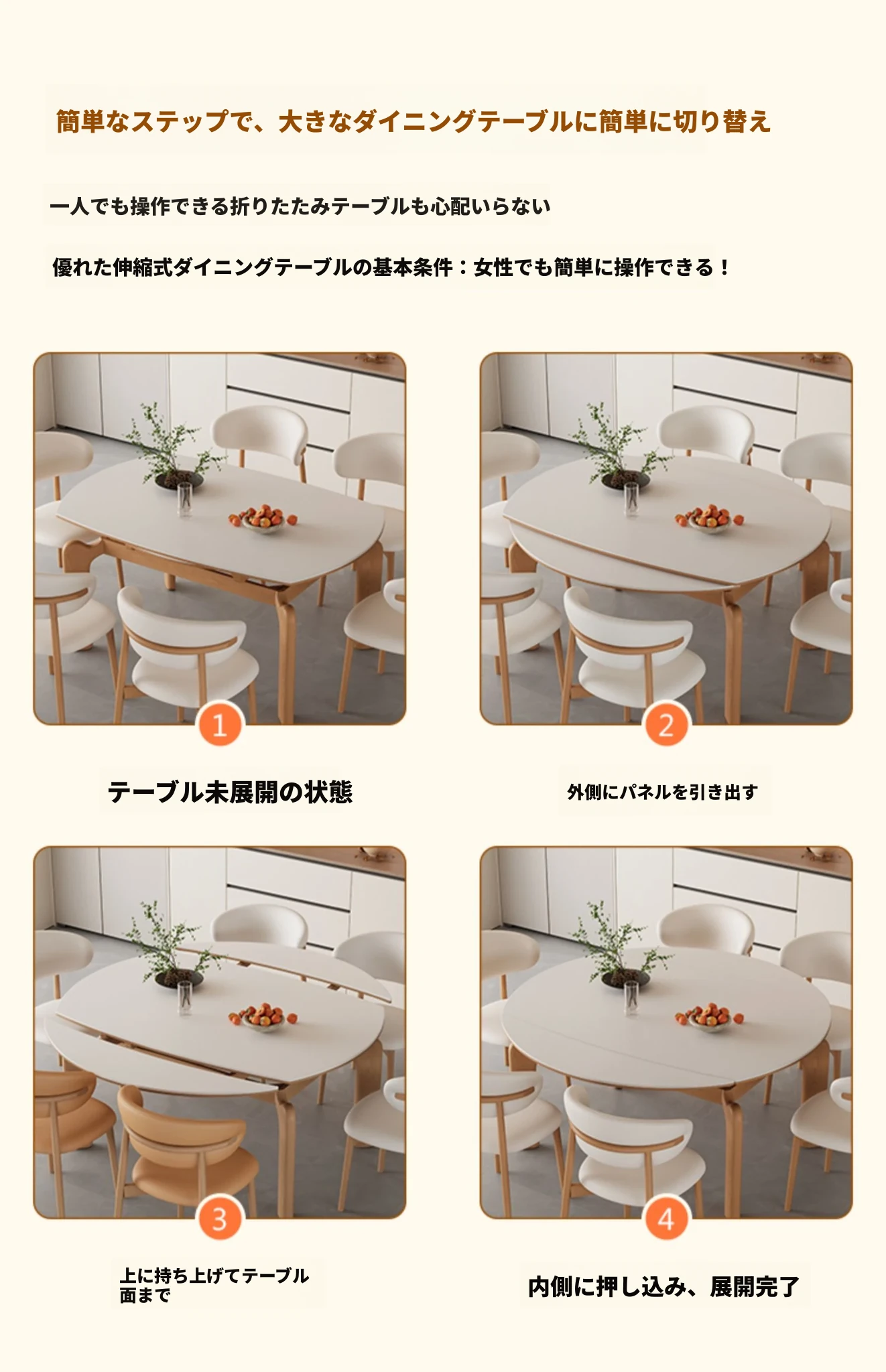 フランス風ナチュラルウッドクリーム仕上げの伸縮式ラウンドダイニングテーブル - 小型住宅に最適!四角と丸の両方に対応可能な折りたたみ式、家族や友人との食事にぴったりです。