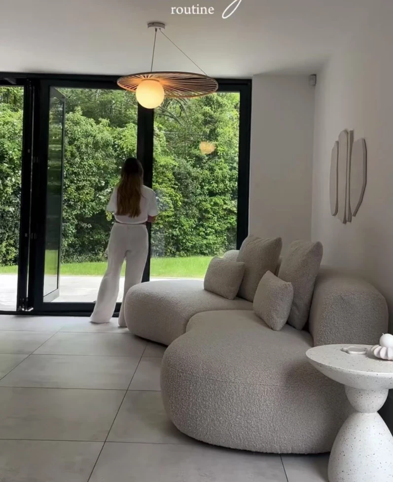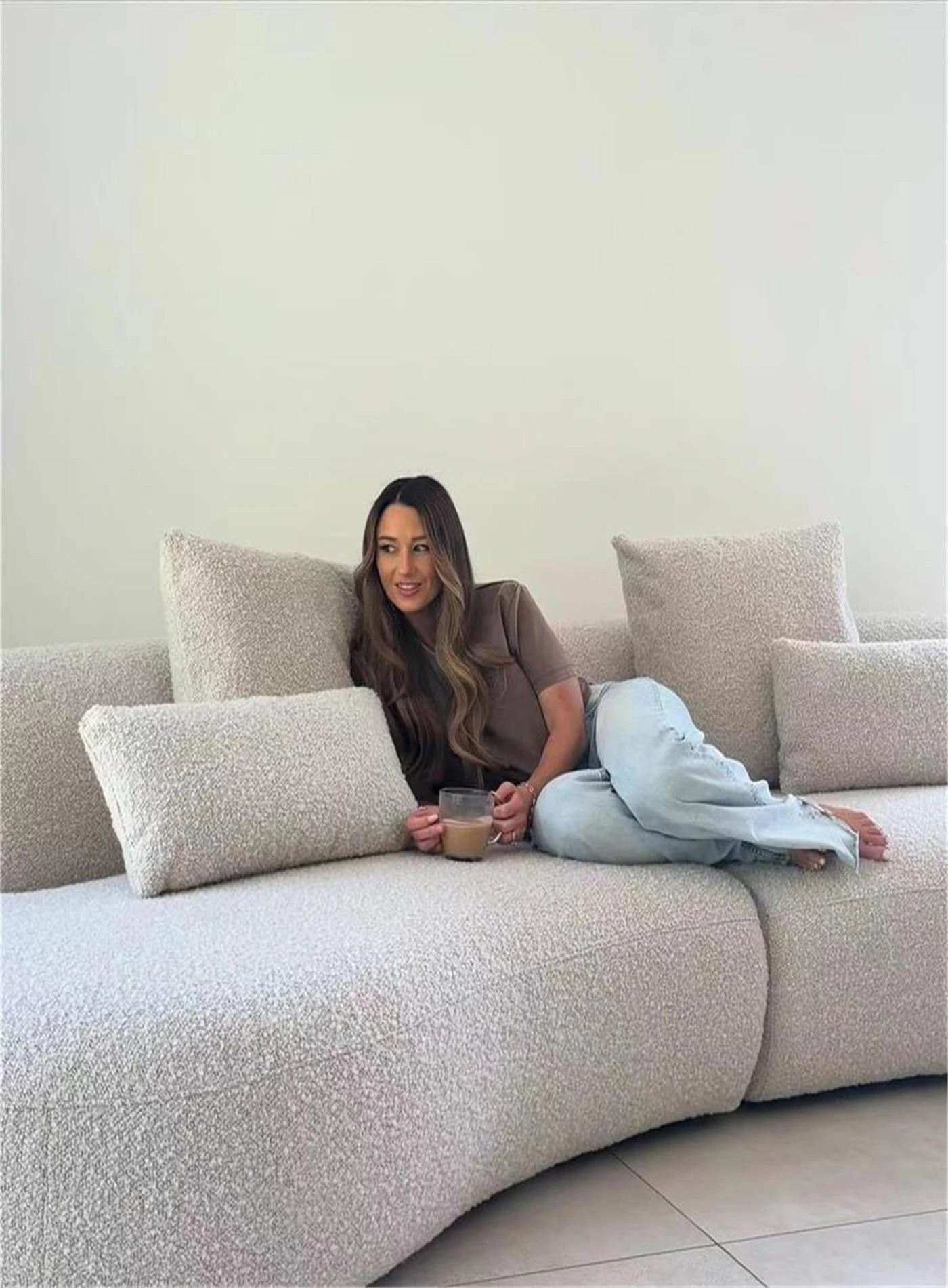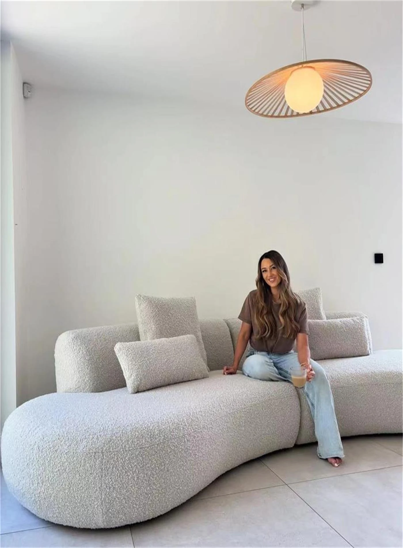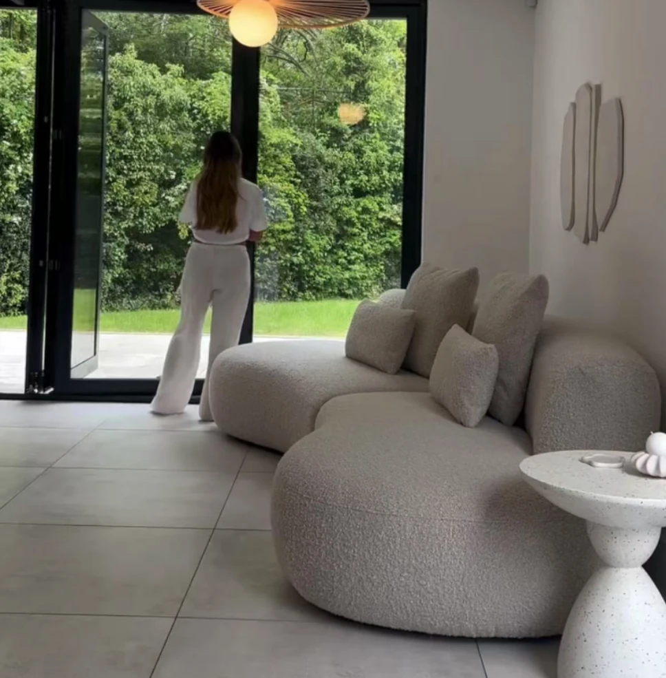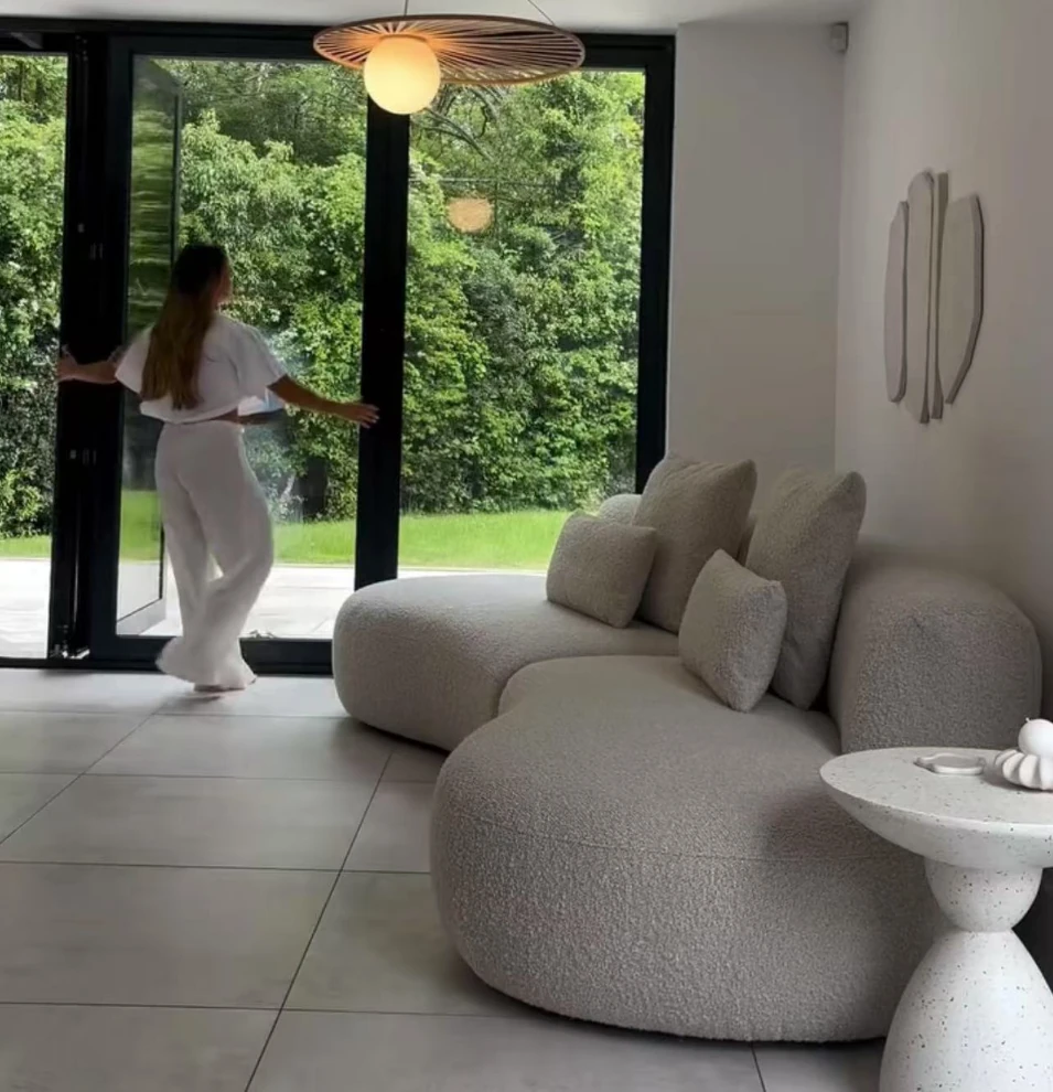 イタリアンミニマリズムの軽やかなラグジュアリー、アーチ型ファブリックカウチソファ。デザイナーによる小型住宅向けの新しいクリエイティブなリラックスソファ、シンプルで洗練されたデザイン!