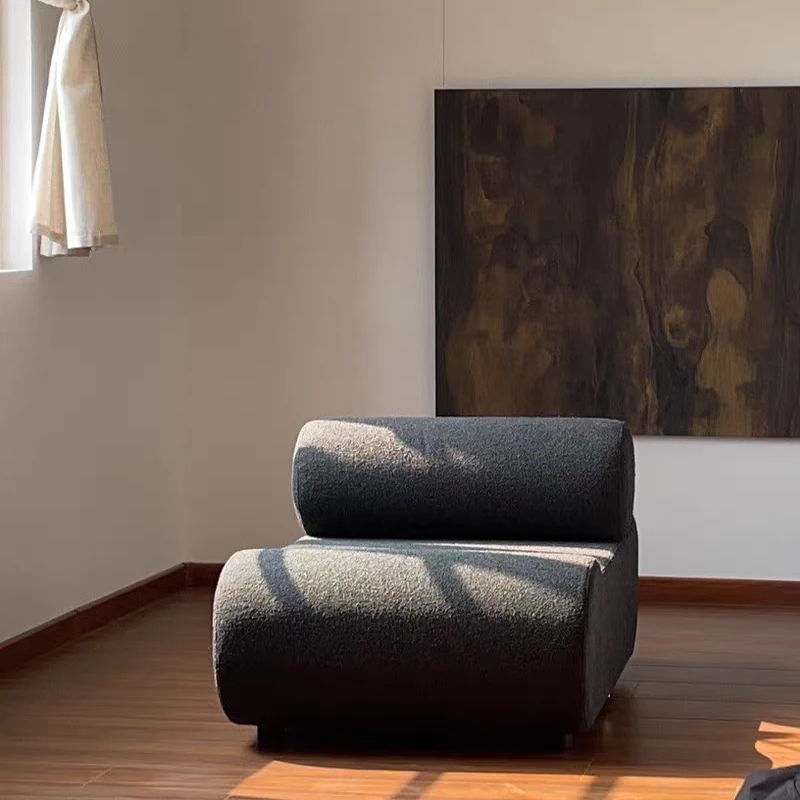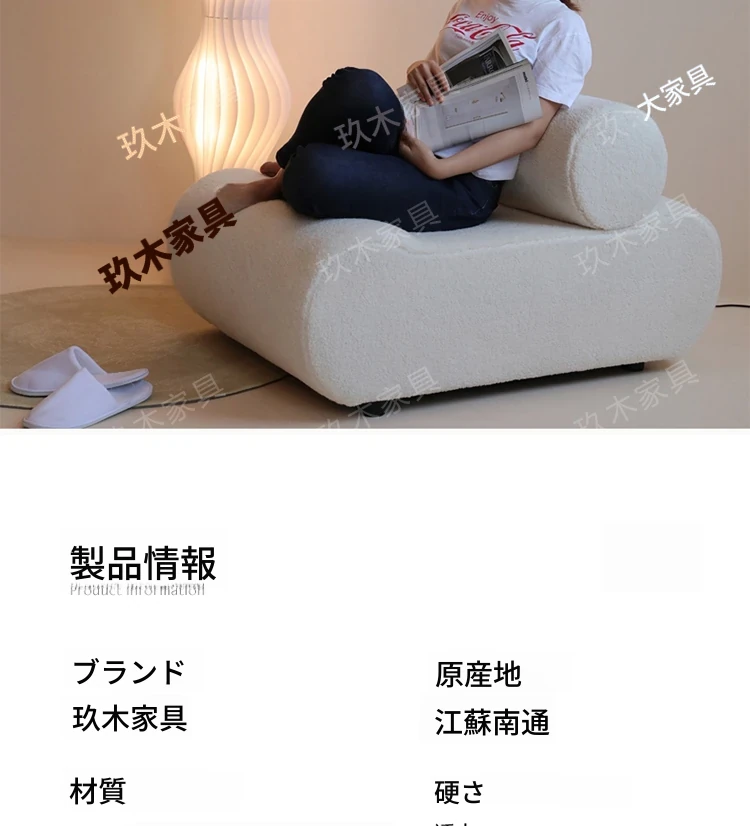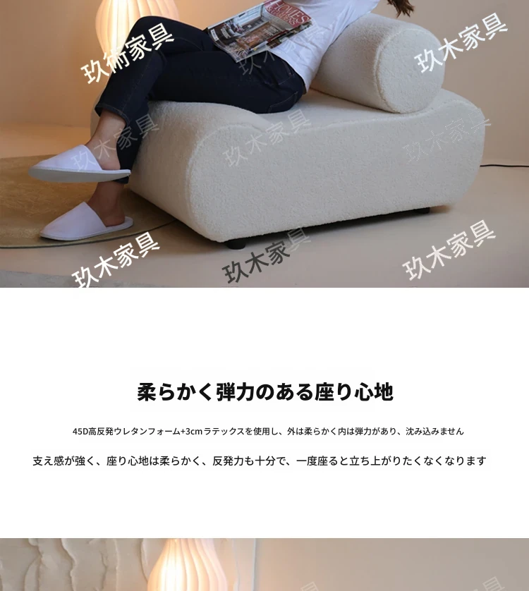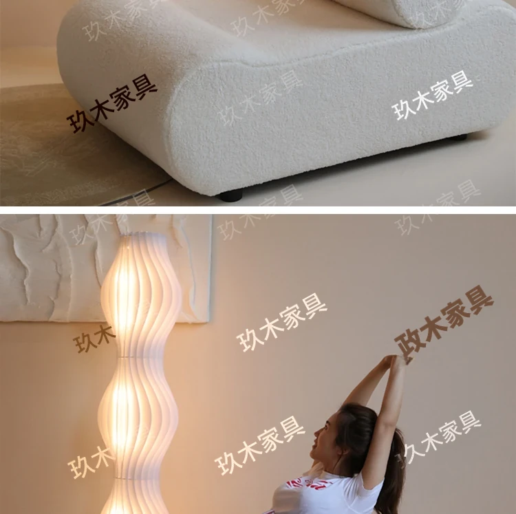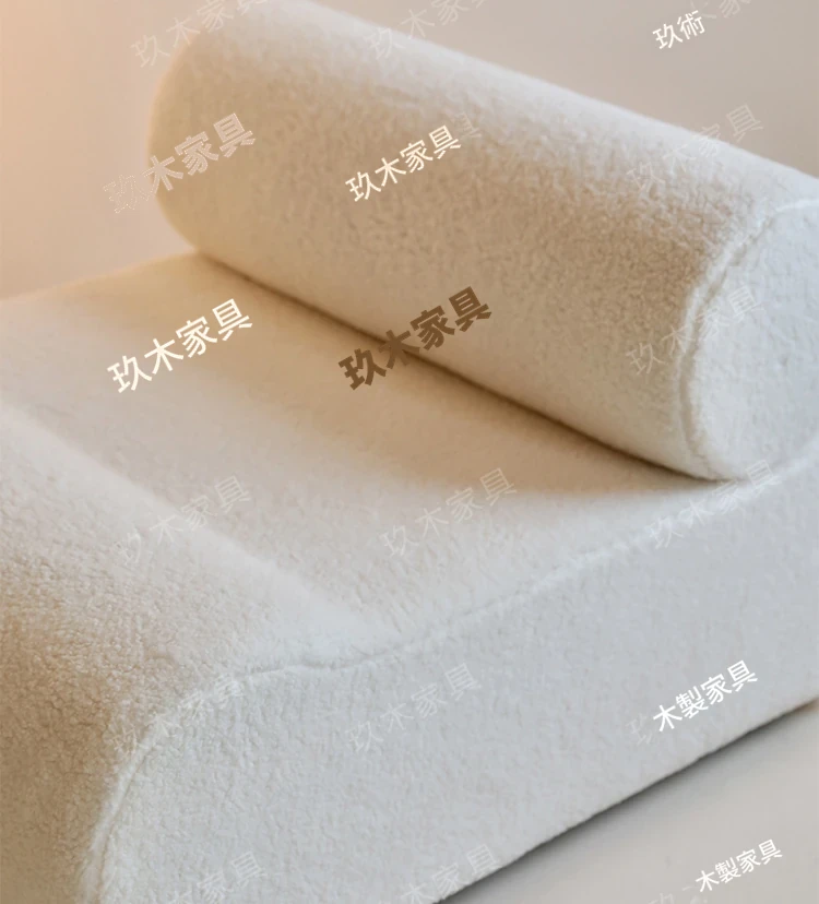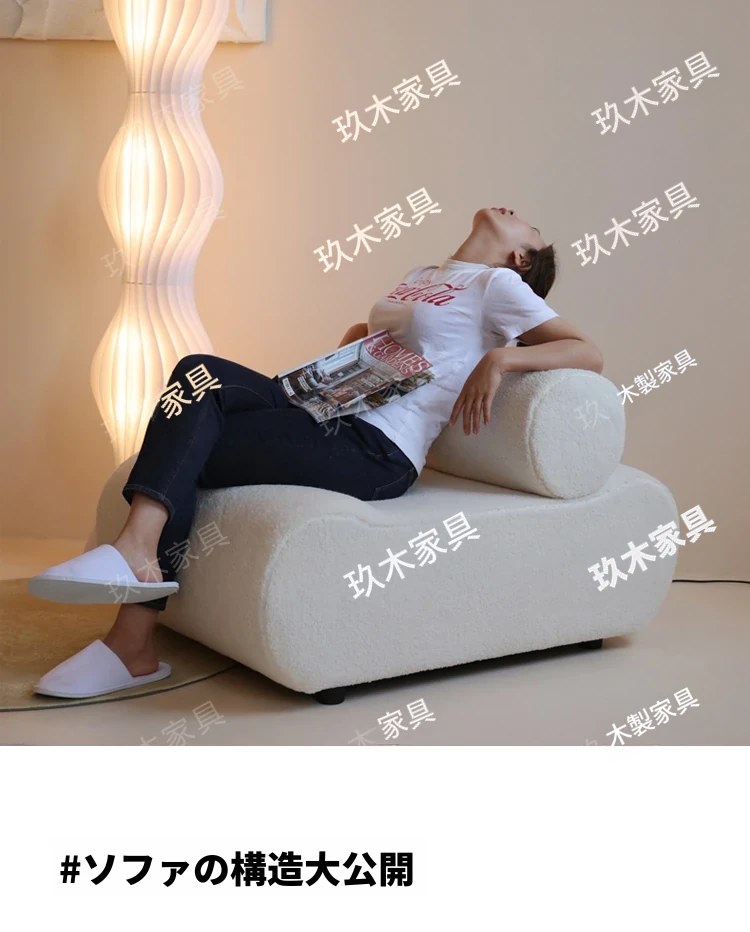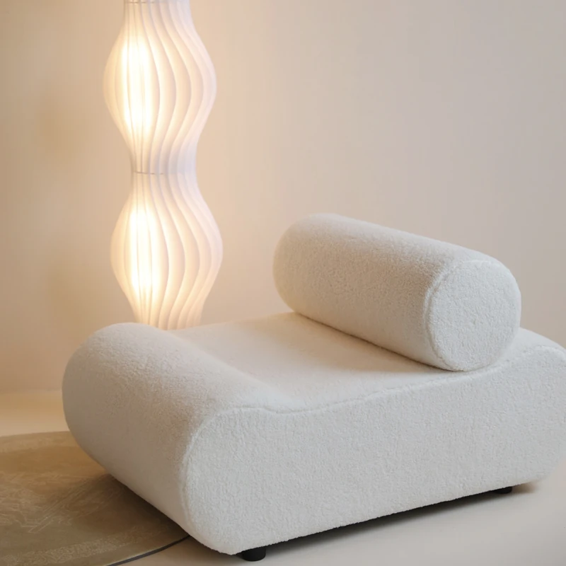 侘寂スタイルのクリーム色ファブリック一人掛けソファ、リラックスチェア。羊毛のようなフワフワの質感が心地よい!新しい民宿やカフェにぴったりの創造的なデザイン。おしゃれで快適なひと時をお楽しみください!