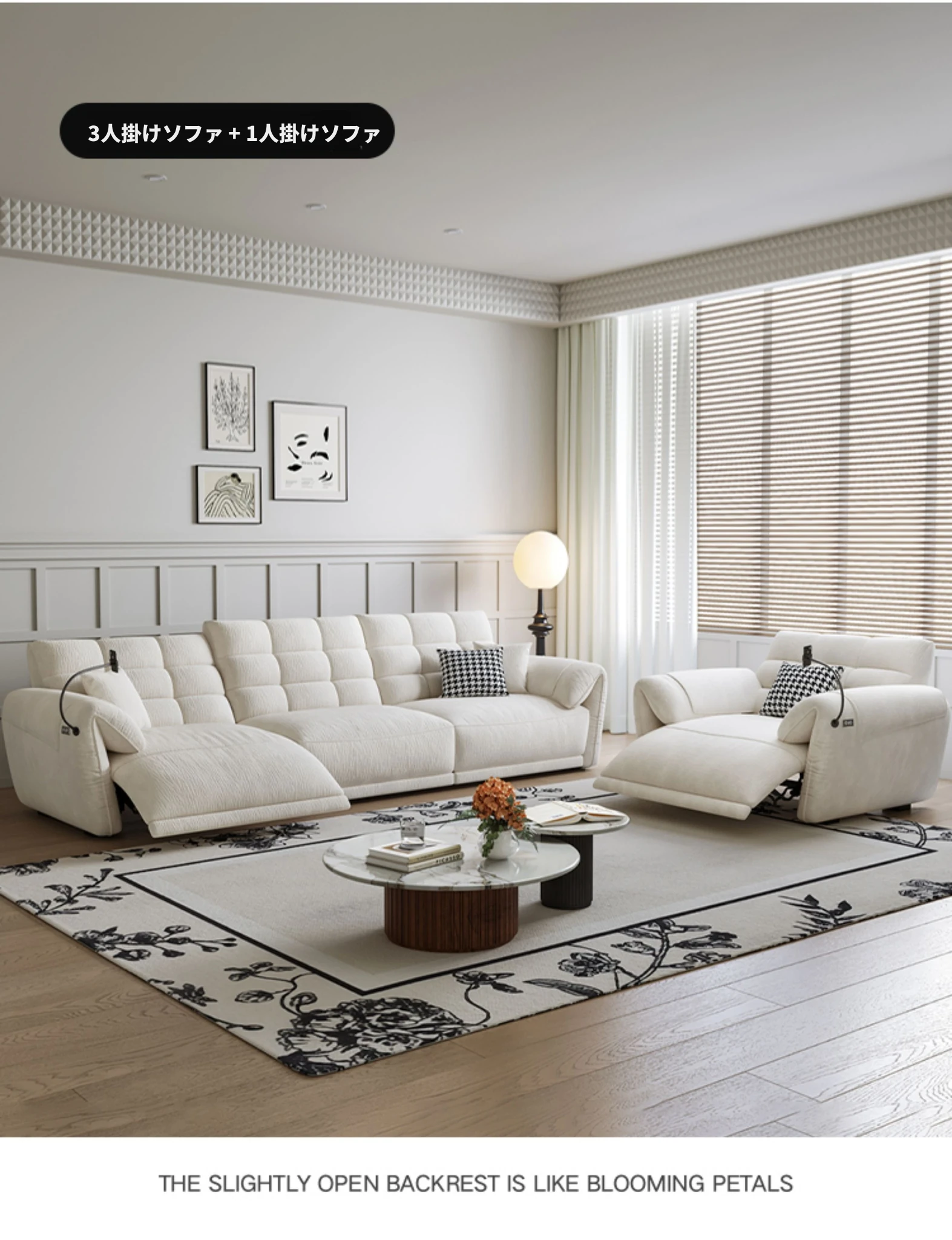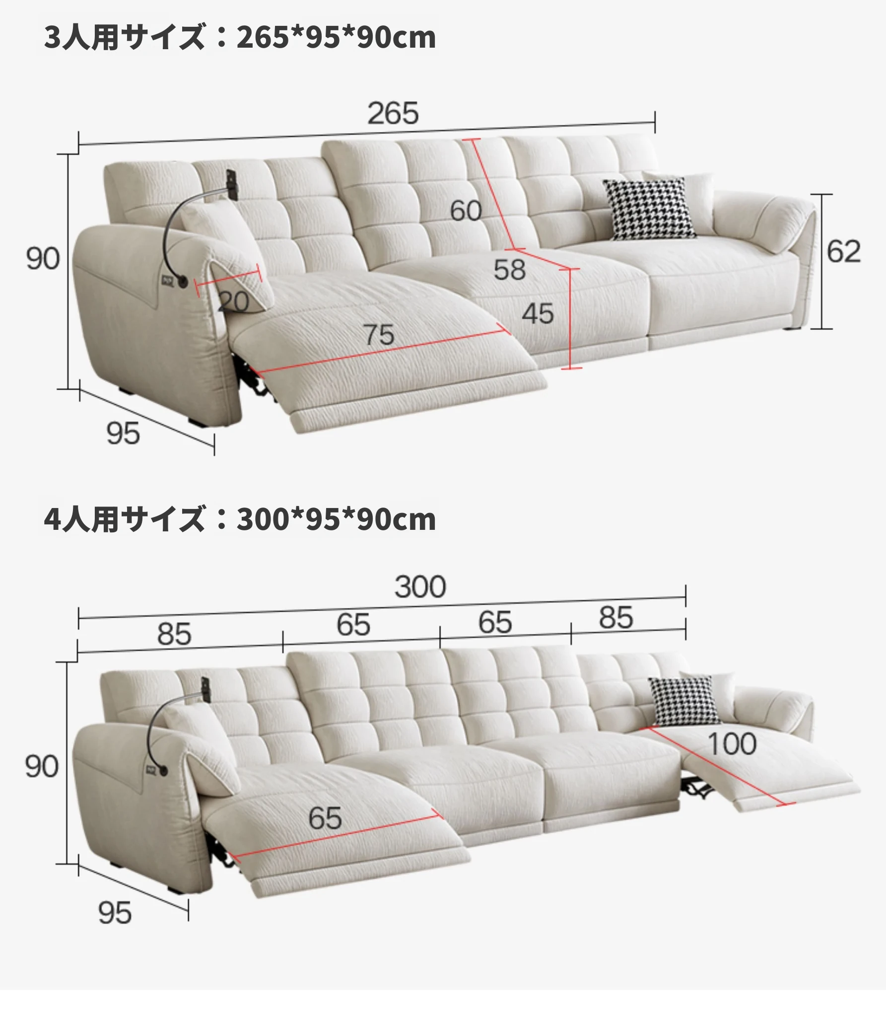 2.65m三人掛け(シングル電動)+ダブルアームの一人掛け(電動付き)