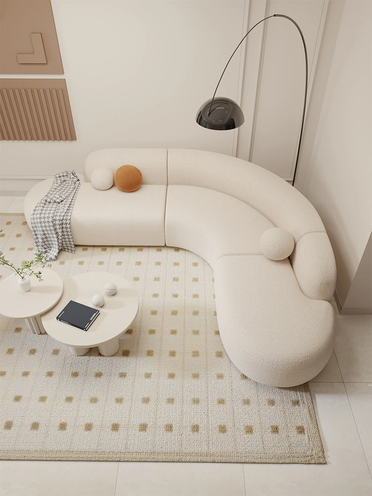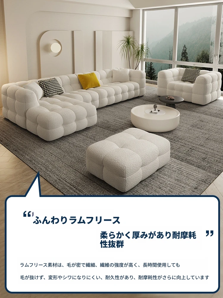 ふわふわコットンキャンディソファ!ミニマルなフレンチ・北欧スタイルのラムウール素材使用。レトロなコーナーシェーズロングで、クリーミーな風合いを楽しめる、あなたのリビングにぴったりの一品です!