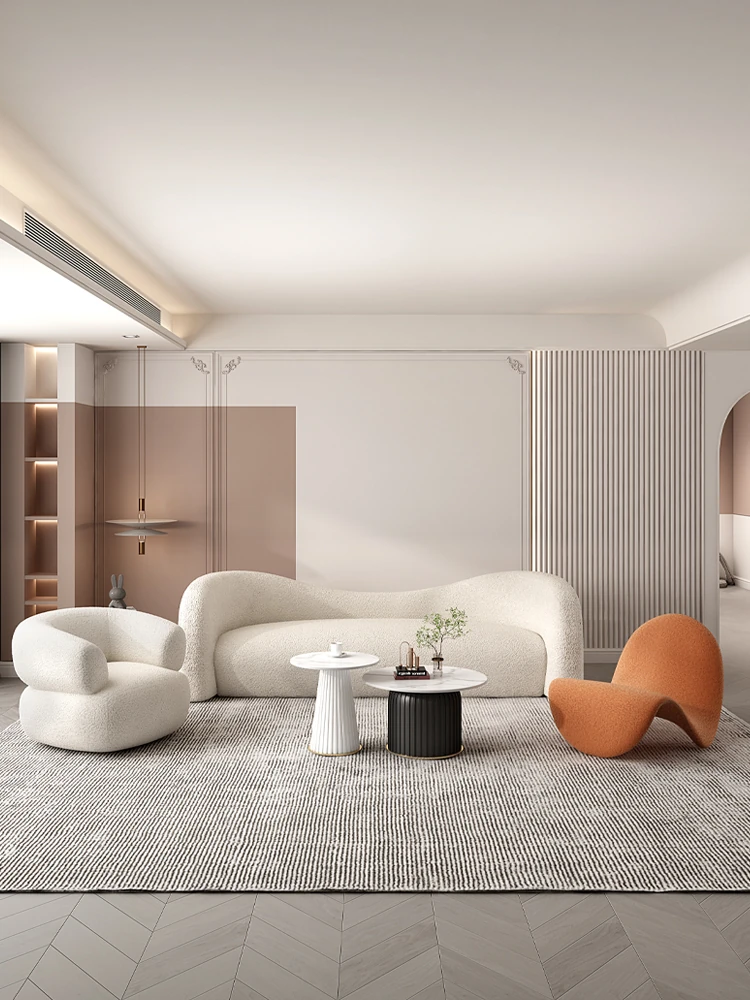 北欧風後現代クリエイティブデザインのウェディングドレス店、美容院、サロン、カジュアルウェアショップに最適!ふわふわのラムファー生地ソファで、心地よい空間を演出しましょう。