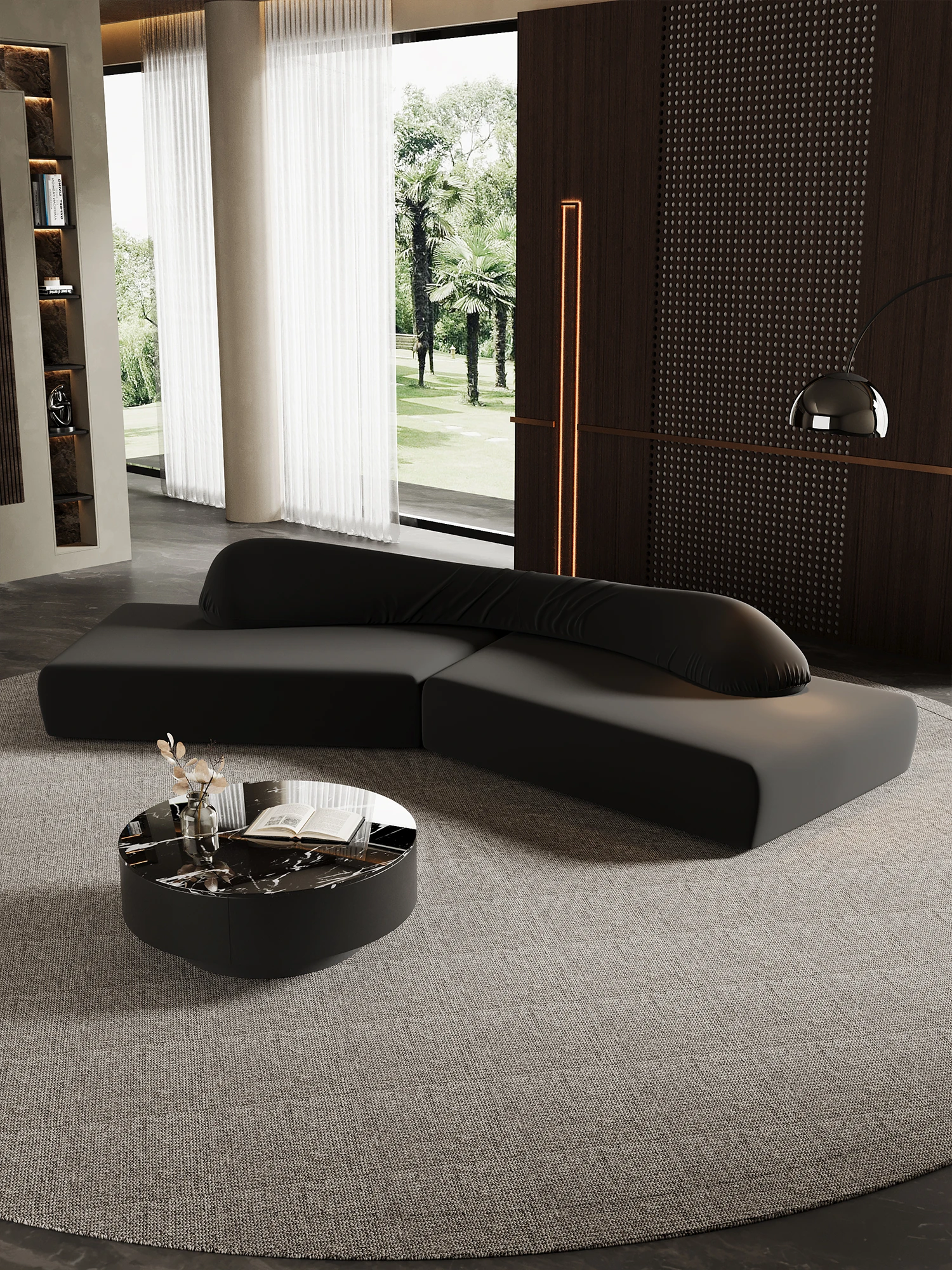 アーチ型シェニール生地ソファ|ラウンド&ユニークデザイン|ヴィラ・ホテル・モデルルーム・民宿に最適なコンビネーション|デザイナーセレクション!快適さとスタイルを両立した上質なソファで、特別な空間を演出します。