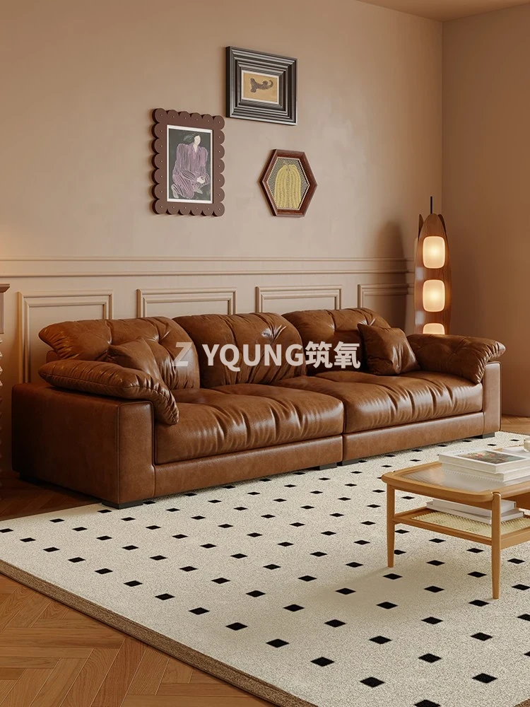 レトロ調オイルワックスレザー雲形ソファ - 小型アパートにぴったりのシンプルでおしゃれな新作!ミニマルなデザインで、居心地の良いリビング空間を演出します。中古風の魅力を持つこのソファで、あなたの家に個性をプラス!