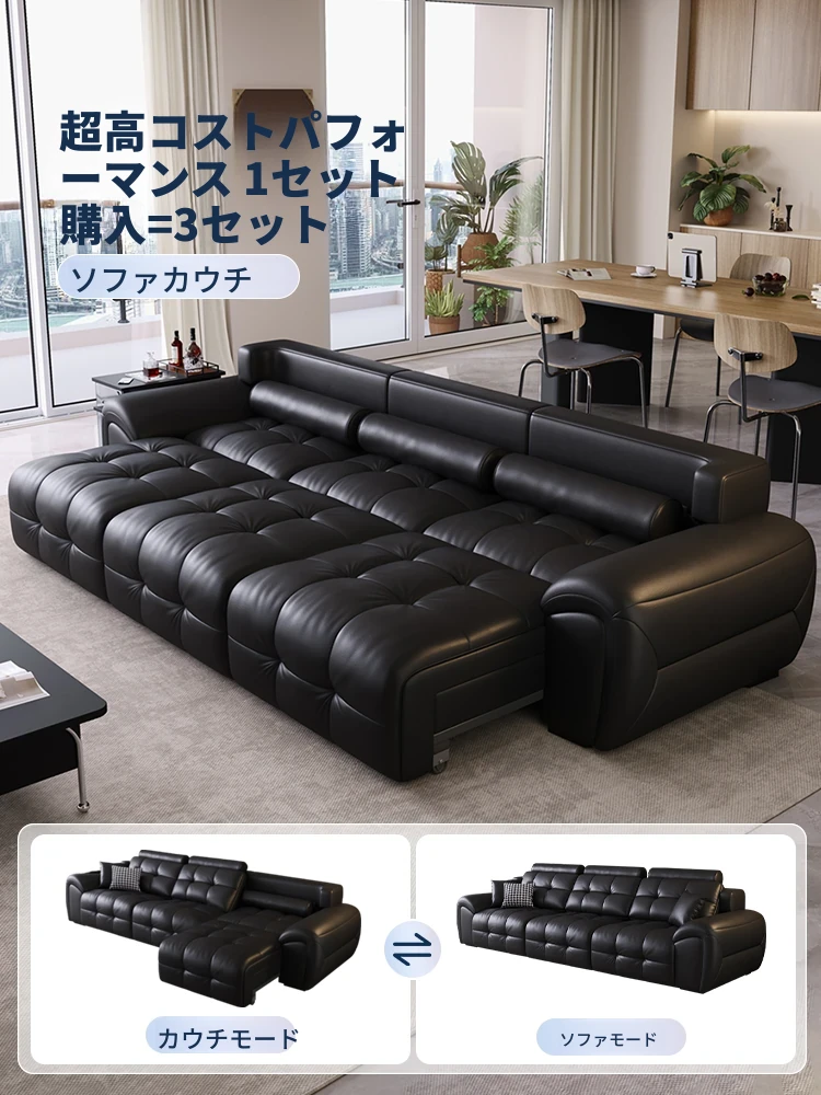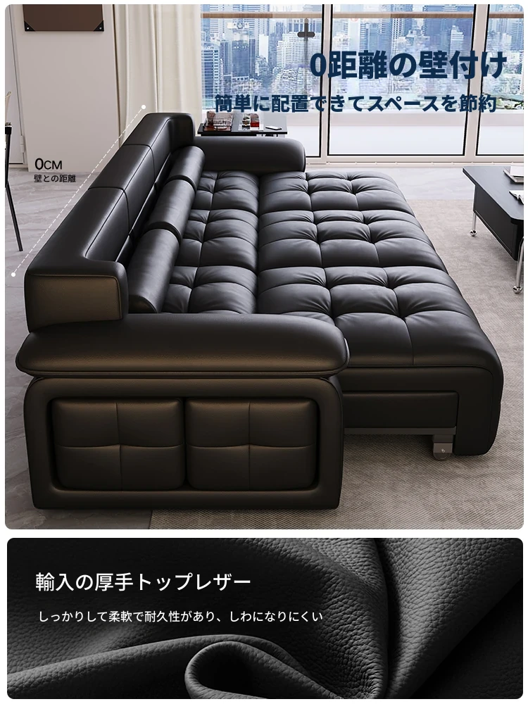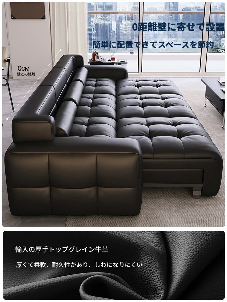 イタリアンミニマルデザインの壁寄せ不要!多機能電動本革カウチソファ 2025年新モデル。上質なトップグレイン牛革を使用したリビング向けの贅沢な一品!あなたの空間に洗練されたスタイルを。