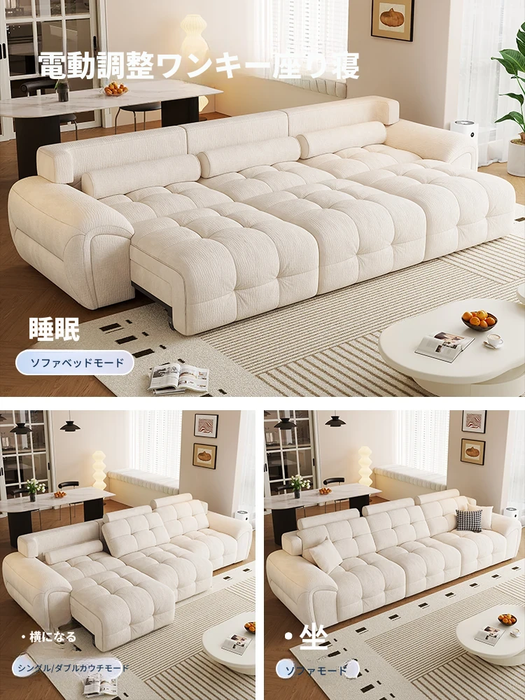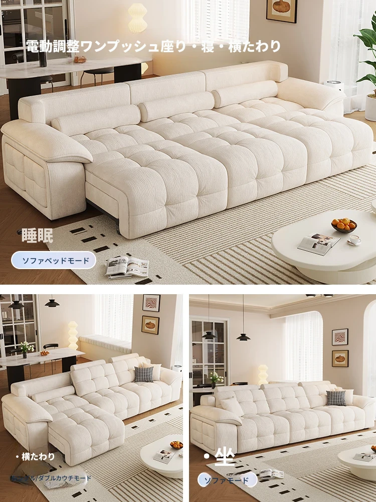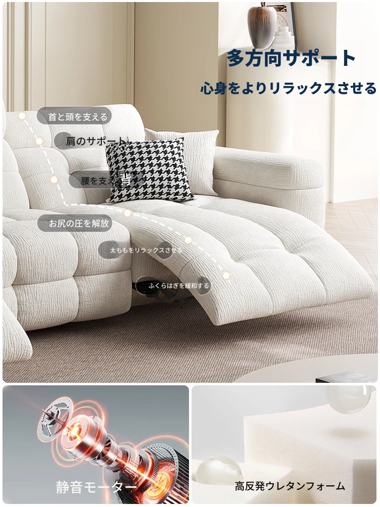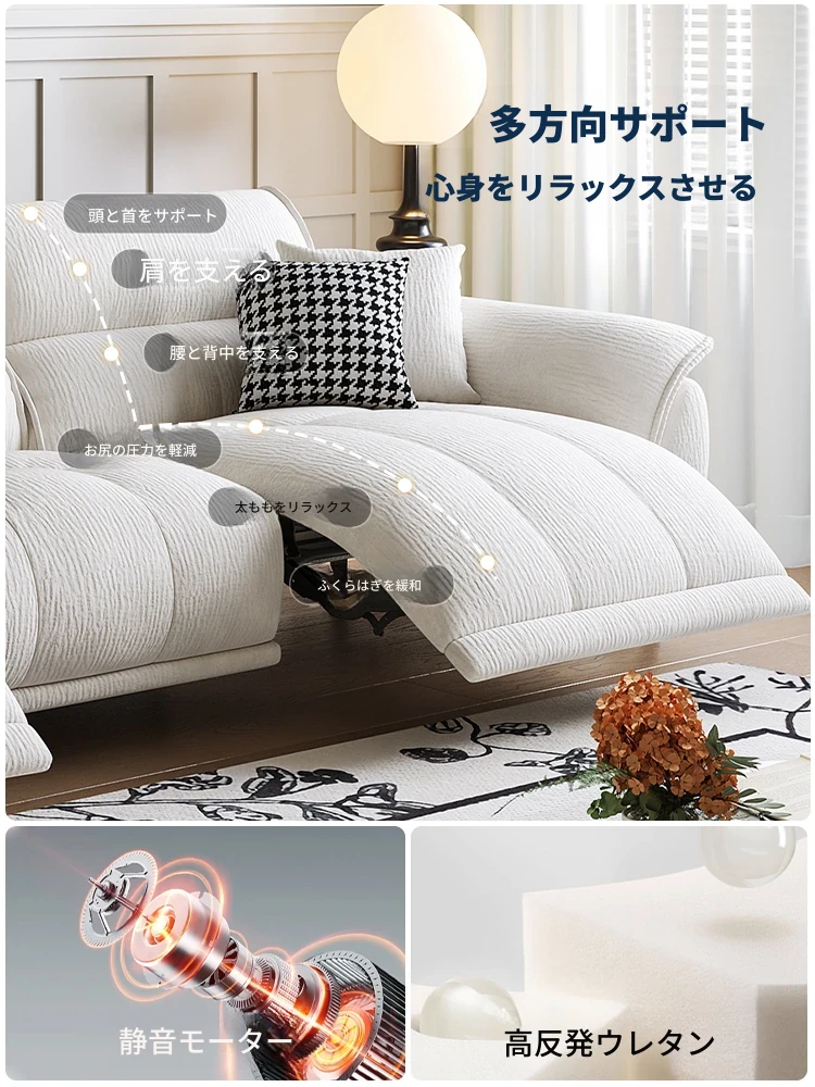 電動機能付きファブリックソファー 猫の爪を守るクリーム風モダンデザイン 調整可能で壁に寄せられるホワイトリビング向け!