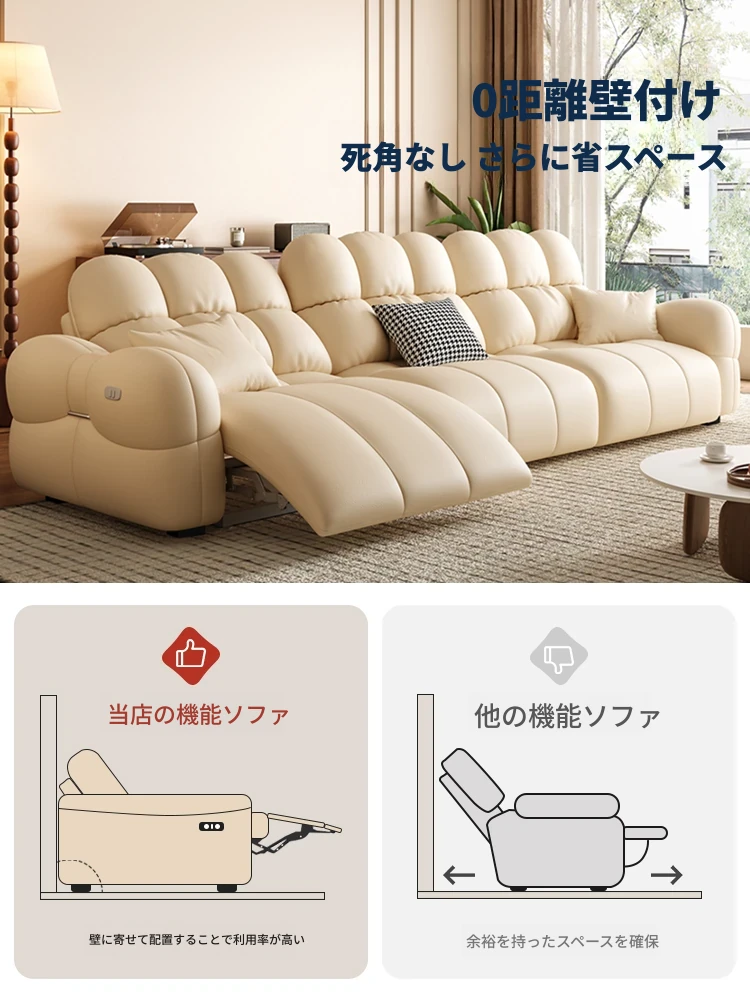 クリームカラーの電動リクライニングソファー!多機能のシェーズロングとリモコン付き伸縮ソファベッドで、快適なリビング空間を実現。あなたのくつろぎタイムをより特別に演出します!