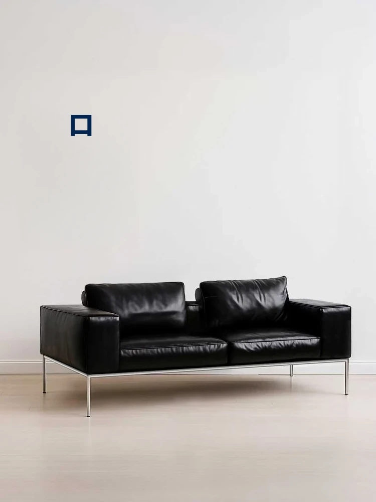 イタリアンミニマリズムのブラックステンレススチールバウハウススタイル中古レザーソファ、ラグジュアリーな小型デザイン、クリエイティブなインテリアにぴったり!