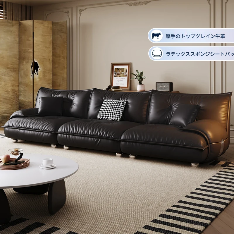 黒糖雲朵本革ソファ - 中古風のリビングにぴったりな黒色オイルワックス本革フレンチヴィンテージ直排ソファ!小型住宅にも最適!贅沢な質感と洗練されたデザインで、居心地の良い空間を演出します。