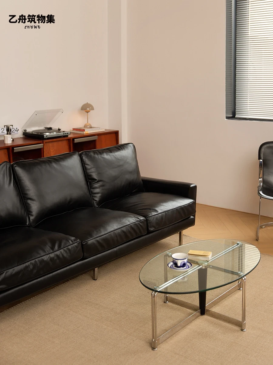 2024年新款!黒色レトロ風本革ソファ - 小型リビングに最適なシンプルなイタリアンミニマリズムデザイン。最高級のトップグレイン牛革使用で、贅沢な座り心地を実現!
