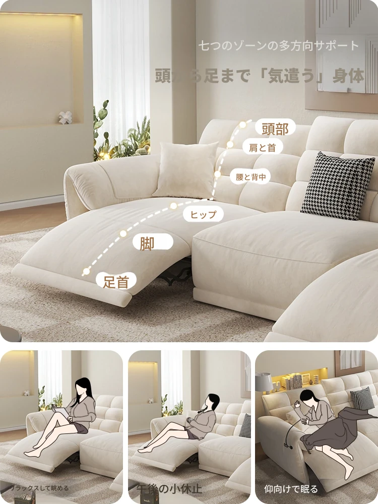 モダンでシンプルな宇宙電動機能リクライニングチェア!猫の爪も気にしない布張りの3人掛けソファ。小さな部屋にもぴったりなクリーム風デザインで、快適なリビング空間を実現します。