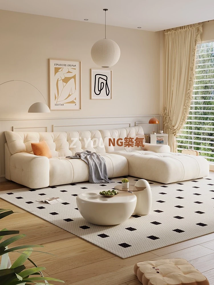 レトロクリーム風の大白色、中古風リビングの創造的デザイン、侘寂スタイルの小型モダンファブリック直置きソファで、心地よい和の空間を演出!おしゃれなインテリアにぴったりです。