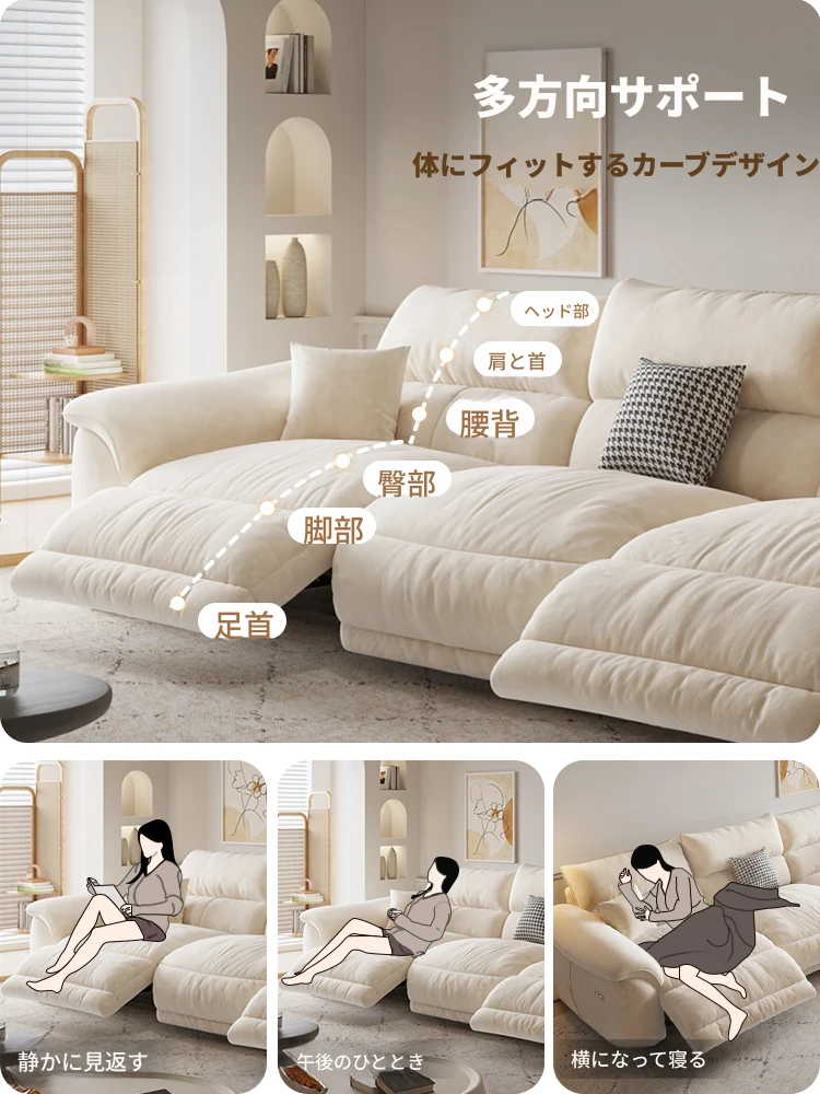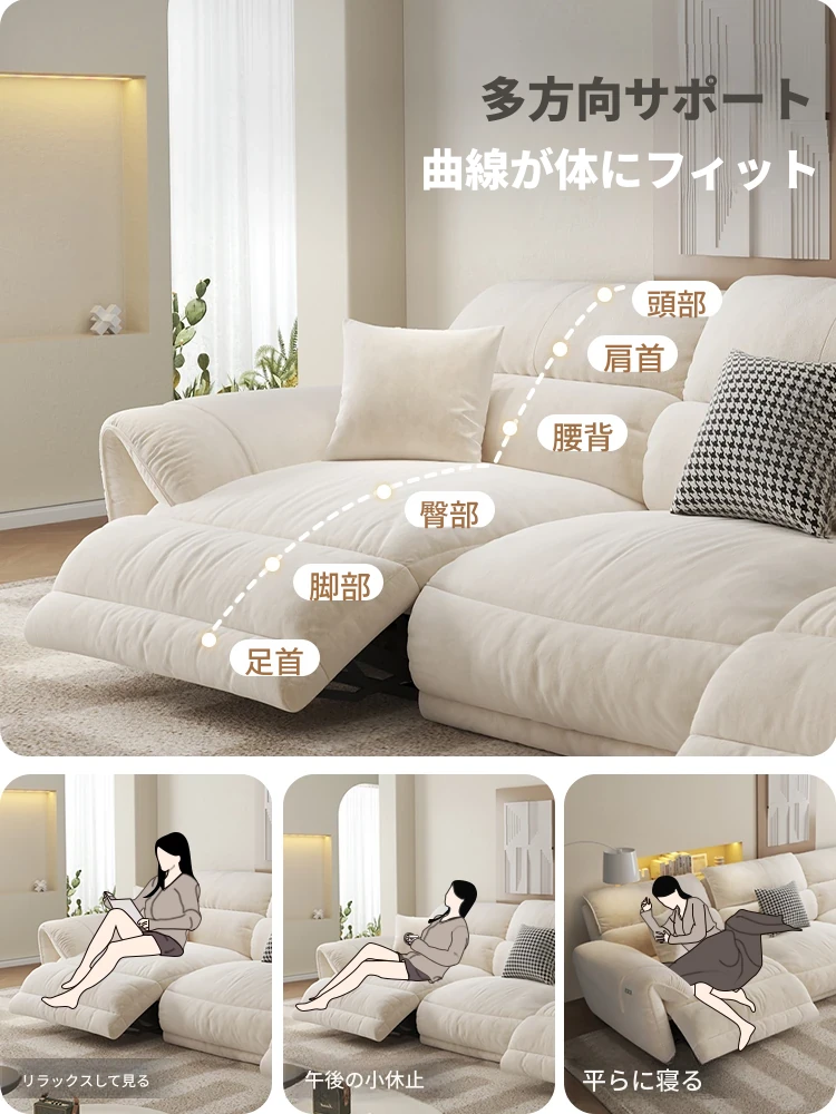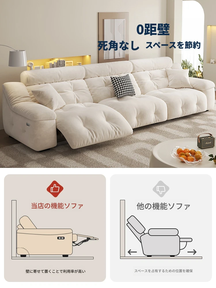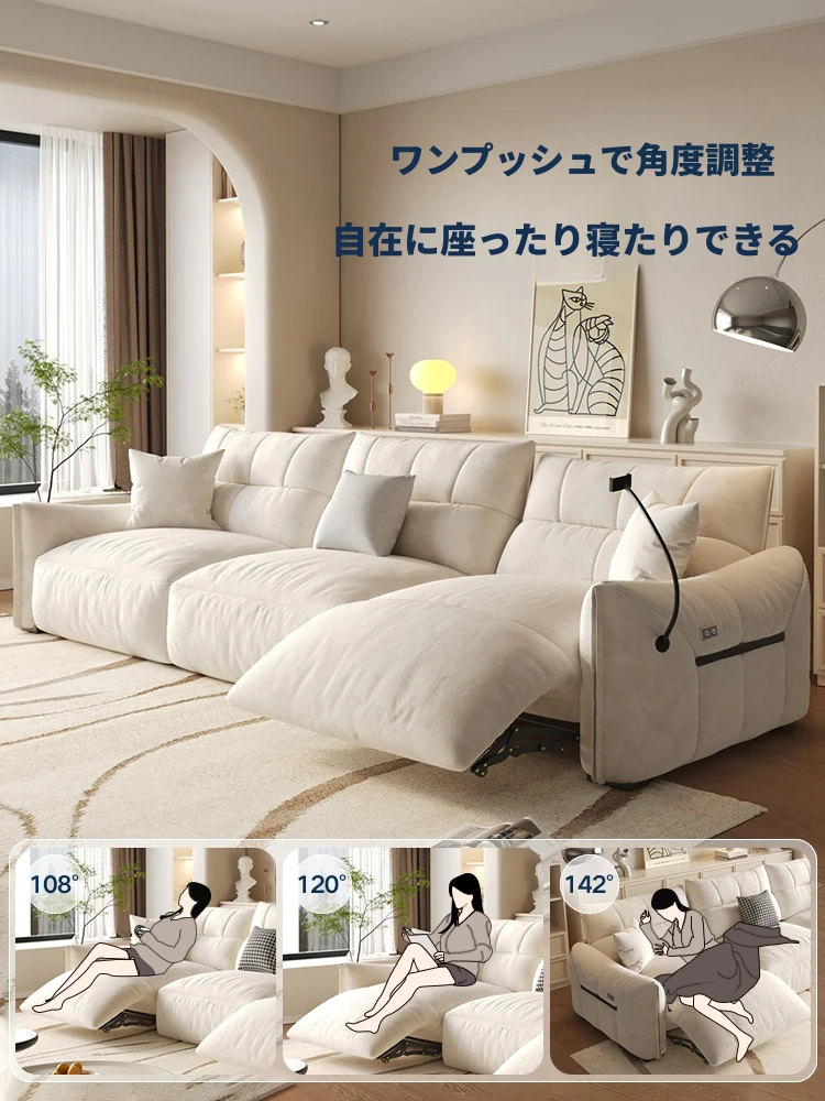 エレガントなスペース機能付き電動ソファ|現代的なミニマリズム|猫の爪にも強いフロッキー素材|小さなリビングにぴったり|クリーミーな風合いでおしゃれ空間を演出!